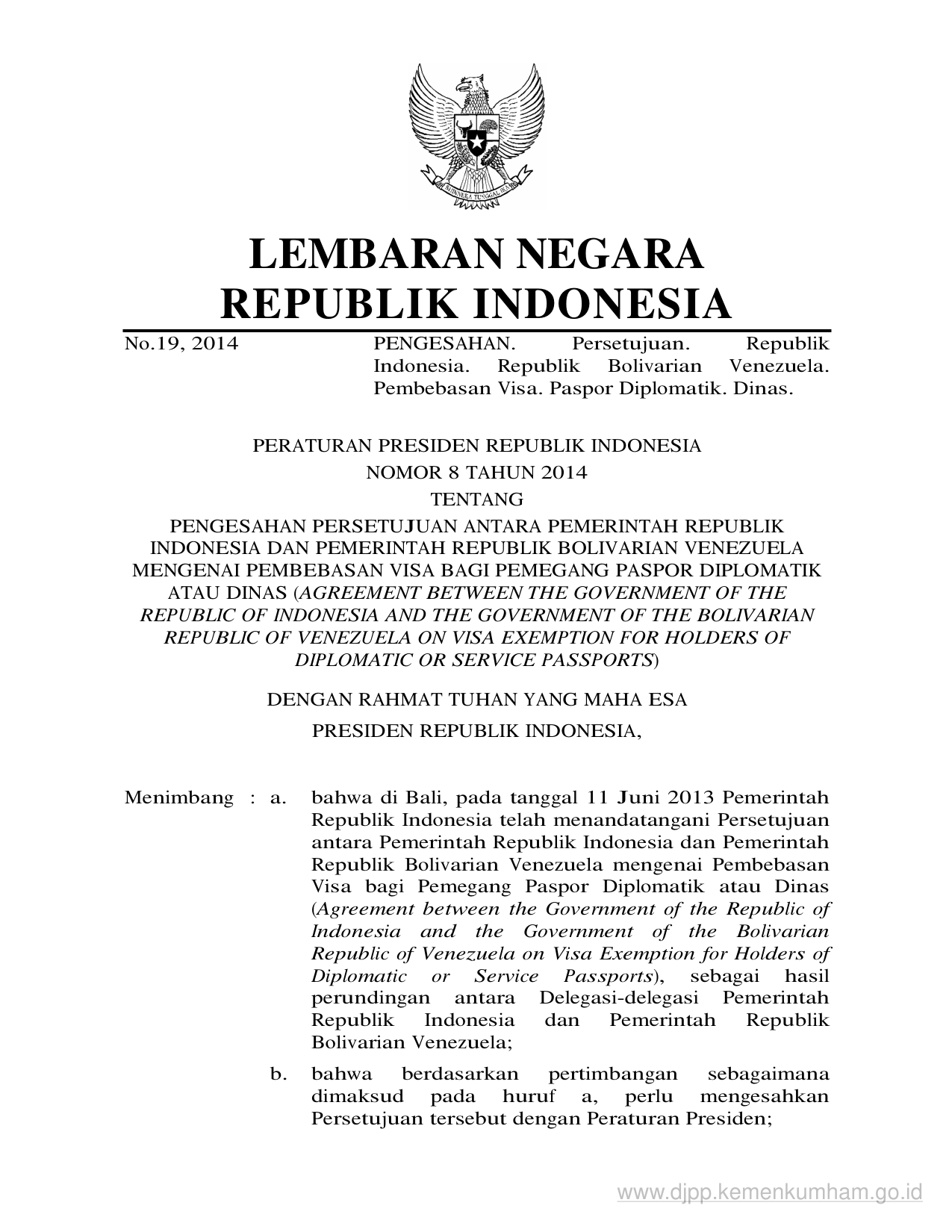 PERPRES Nomor 8 Tahun 2014 | Peraturan Presiden Nomor 8 Tahun 2014 tentang PENGESAHAN PERSETUJUAN ANTARA PEMERINTAH REPUBLIK INDONESIA DAN PEMERINTAH REPUBLIK BOLIVARIAN VENEZUELA MENGENAI PEMBEBASAN VISA BAGI PEMEGANG PASPOR DIPLOMATIK ATAU DINAS (AGREEMENT BETWEEN THE GOVERNMENT OF THE REPUBLIC OF INDONESIA AND THE GOVERNMENT OF THE BOLIVARIAN REPUBLIC OF VENEZUELA ON VISA EXEMPTION FOR HOLDERS OF DIPLOMATIC OR SERVICE PASSPORTS)