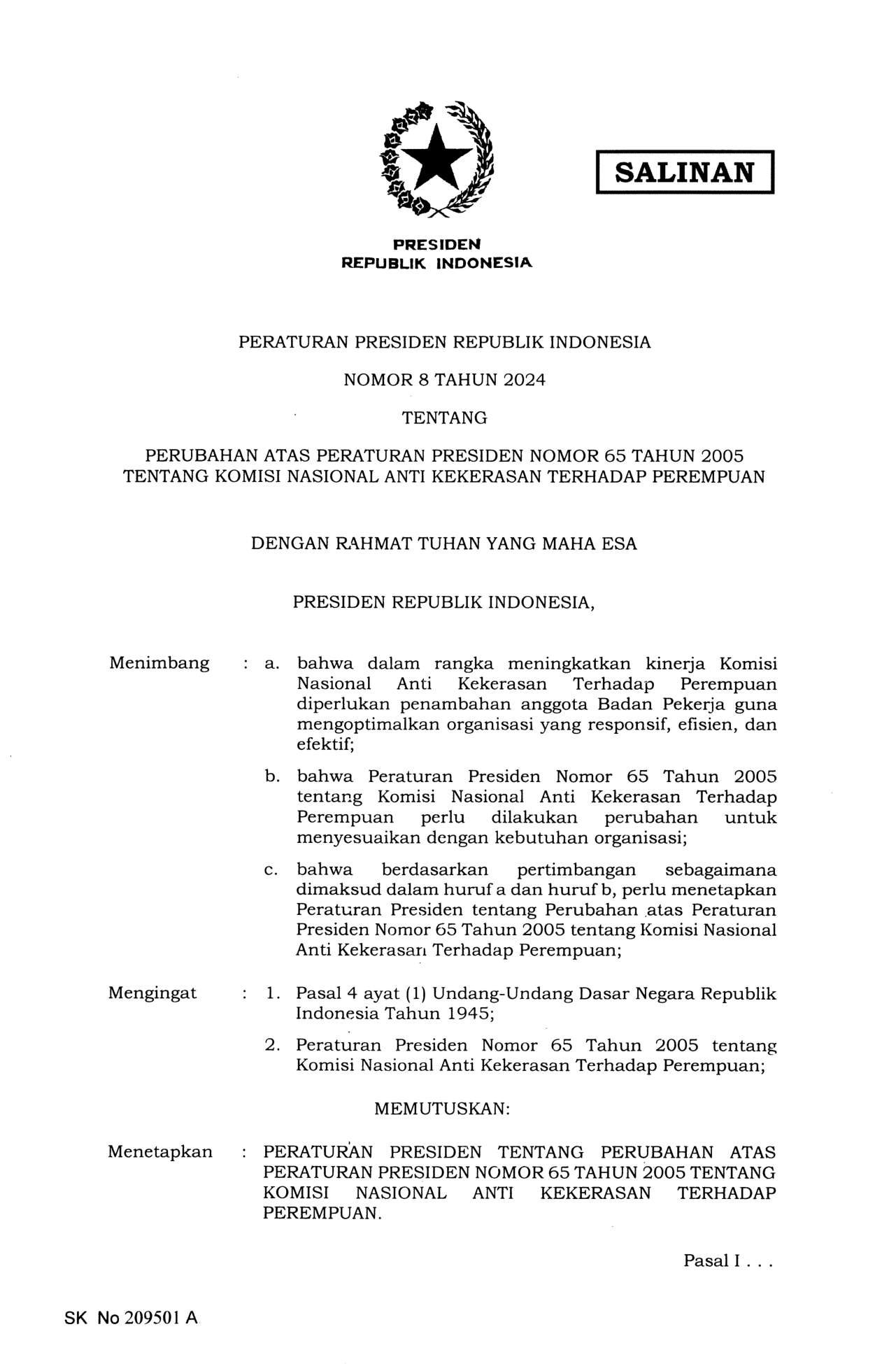 PERPRES Nomor 8 Tahun 2024 | Peraturan Presiden Nomor 8 Tahun 2024 tentang PERUBAHAN ATAS PERATURAN PRESIDEN NOMOR 65 TAHUN 2005 TENTANG KOMISI NASIONAL ANTI KEKERASAN TERHADAP PEREMPUAN