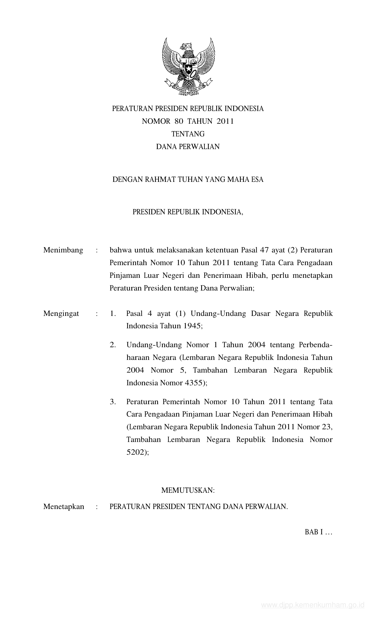 PERPRES Nomor 80 Tahun 2011 | Peraturan Presiden Nomor 80 Tahun 2011 tentang DANA PERWALIAN