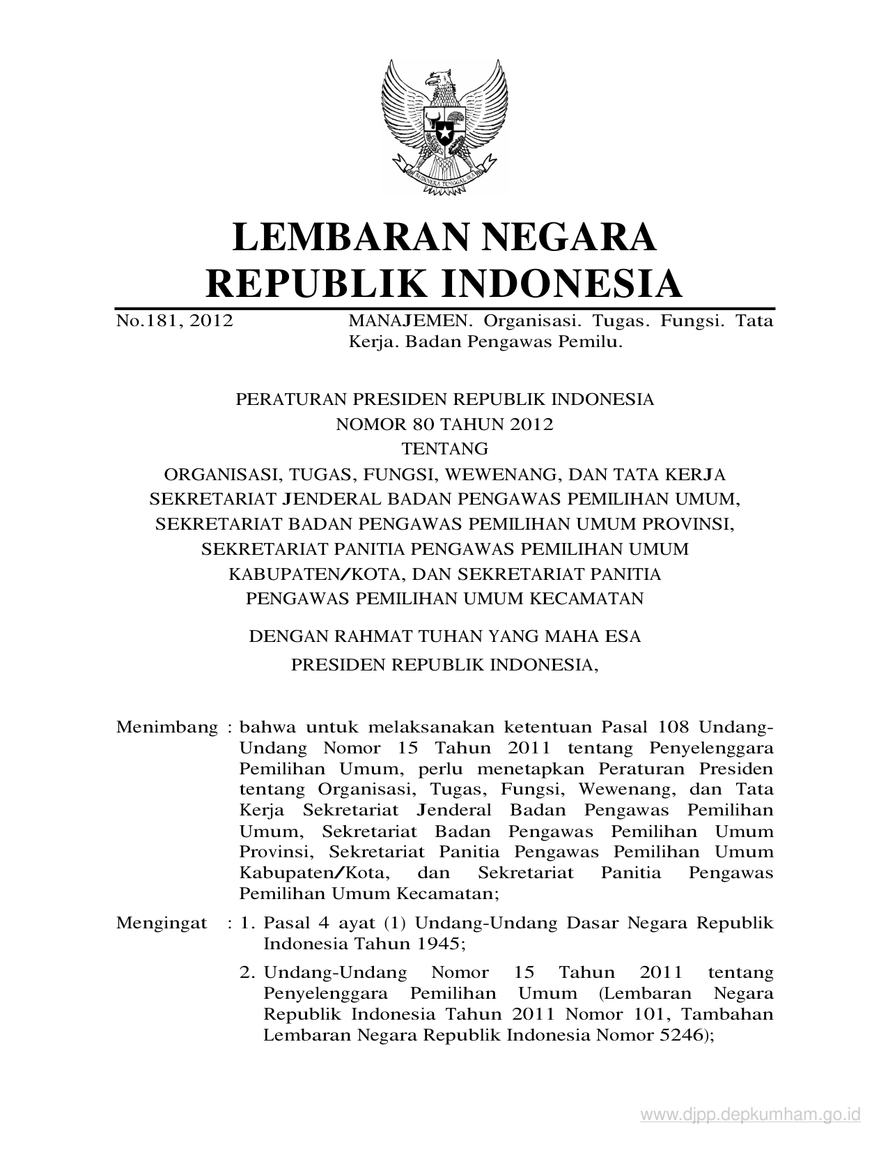 PERPRES Nomor 80 Tahun 2012 | Peraturan Presiden Nomor 80 Tahun 2012 tentang ORGANISASI, TUGAS, FUNGSI, WEWENANG, DAN TATA KERJA SEKRETARIAT JENDERAL BADAN PENGAWAS PEMILIHAN UMUM, SEKRETARIAT BADAN PENGAWAS PEMILIHAN UMUM PROVINSI, SEKRETARIAT PANITIA PENGAWAS PEMILIHAN UMUM KABUPATEN/KOTA, DAN SEKRETARIAT PANITIA PENGAWAS PEMILIHAN UMUM KECAMATAN