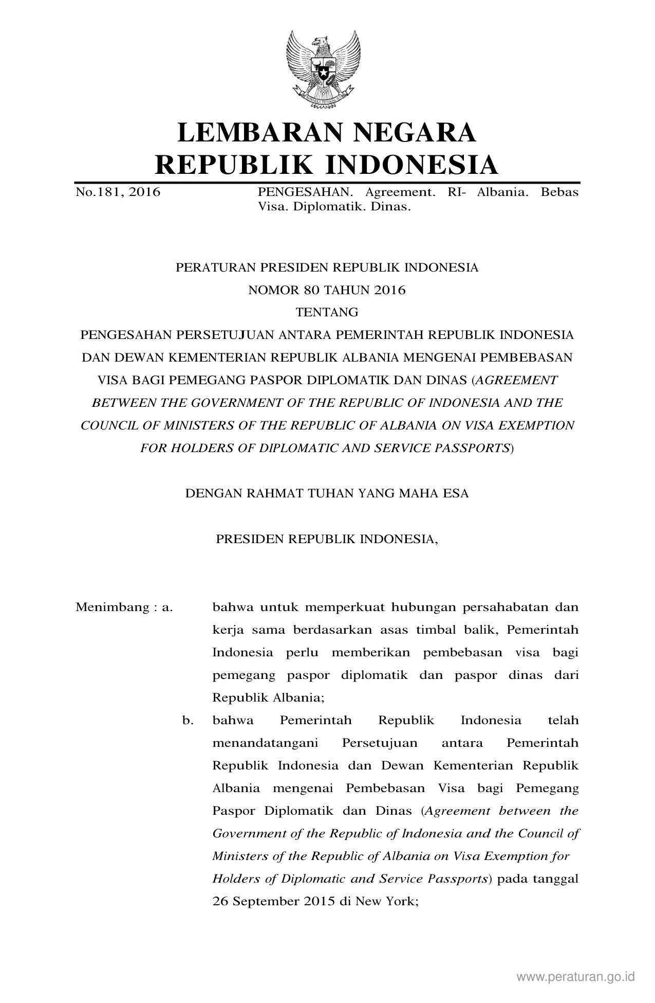 PERPRES Nomor 80 Tahun 2016 | Peraturan Presiden Nomor 80 Tahun 2016 tentang PENGESAHAN PERSETUJUAN ANTARA PEMERINTAH REPUBLIK INDONESIA DAN DEWAN KEMENTERIAN REPUBLIK ALBANIA MENGENAI PEMBEBASAN VISA BAGI PEMEGANG PASPOR DIPLOMATIK DAN DINAS (AGREEMENT BETWEEN THE GOVERNMENT OF THE REPUBLIC OF INDONESIA AND THE COUNCIL OF MINISTERS OF THE REPUBLIC OF ALBANIA ON VISA EXEMPTION FOR HOLDERS OF DIPLOMATIC AND SERVICE PASSPORTS)