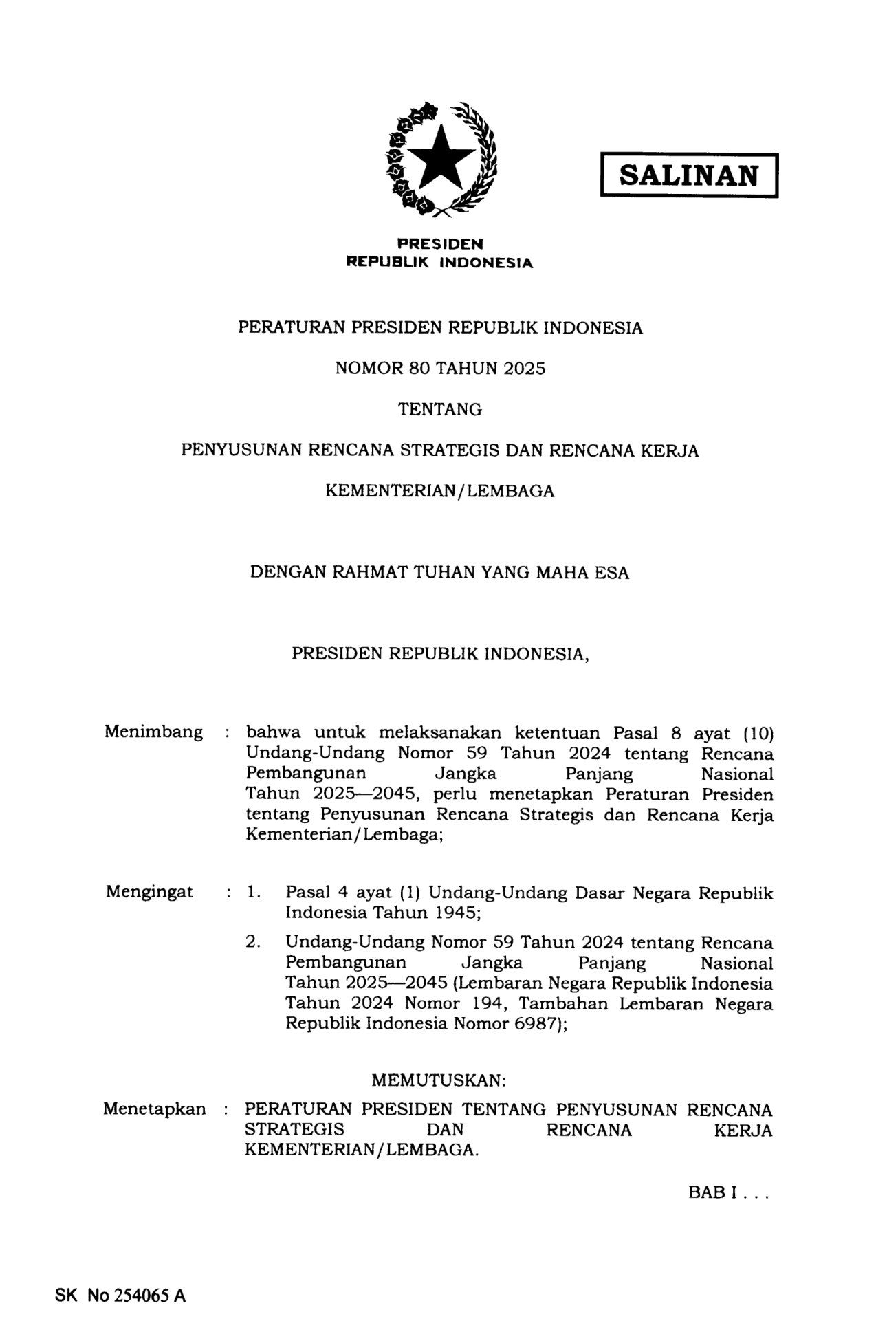 PERPRES Nomor 80 Tahun 2025 | Peraturan Presiden Nomor 80 Tahun 2025 tentang PENYUSUNAN RENCANA STRATEGIS DAN RENCANA KERJA KEMENTERIAN/LEMBAGA