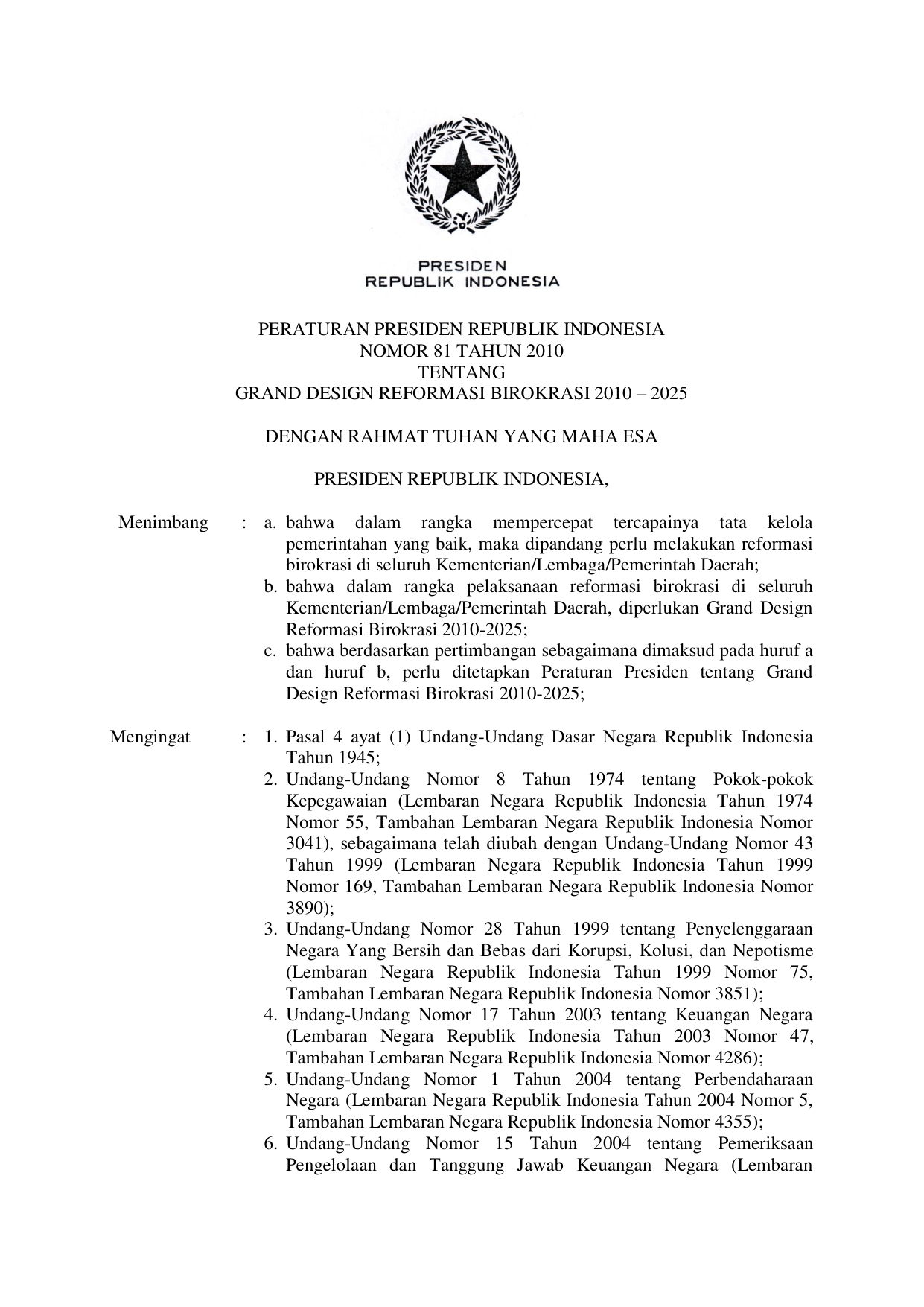 PERPRES Nomor 81 Tahun 2010 | Peraturan Presiden Nomor 81 Tahun 2010 tentang GRAND DESIGN REFORMASI BIROKRASI 2010-2025