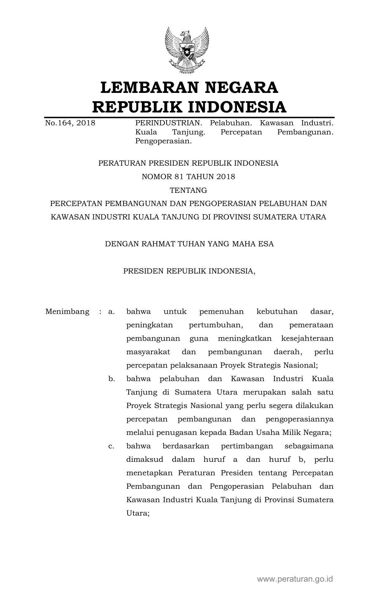 PERPRES Nomor 81 Tahun 2018 | Peraturan Presiden Nomor 81 Tahun 2018 tentang Percepatan Pembangunan dan Pengoperasian Pelabuhan dan Kawasan Industri Kuala Tanjung di Provinsi Sumatera Utara