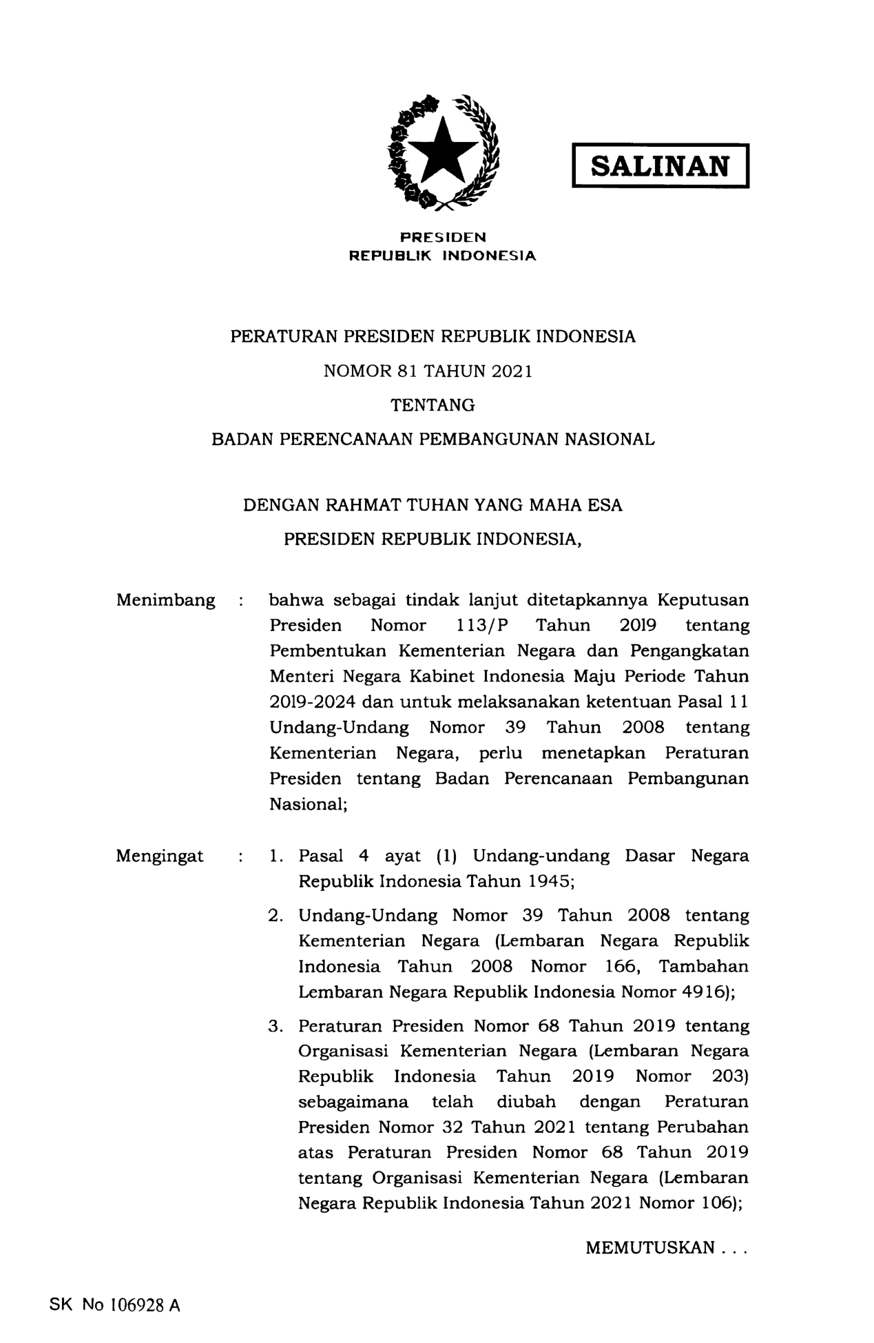 PERPRES Nomor 81 Tahun 2021 | Peraturan Presiden Nomor 81 Tahun 2021 tentang BADAN PERENCANAAN PEMBANGUNAN NASIONAL