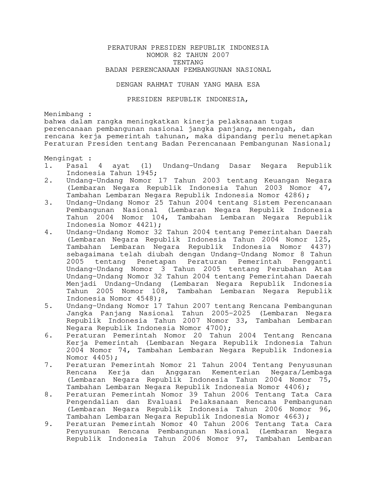 PERPRES Nomor 82 Tahun 2007 | Peraturan Presiden Nomor 82 Tahun 2007 tentang BADAN PERENCANAAN PEMBANGUNAN NASIONAL