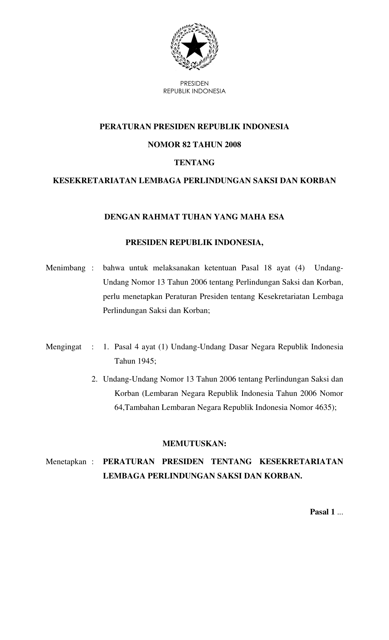 PERPRES Nomor 82 Tahun 2008 | Peraturan Presiden Nomor 82 Tahun 2008 tentang KESEKRETARIATAN LEMBAGA PERLINDUNGAN SANKSI DAN KORBAN