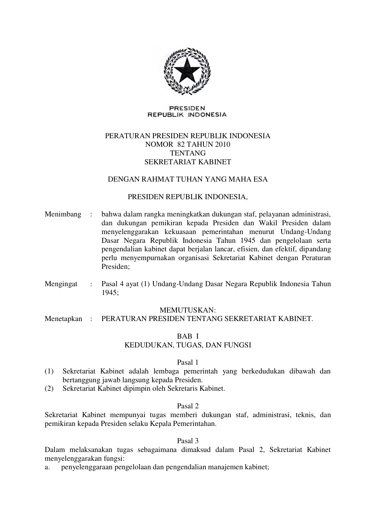 PERPRES Nomor 82 Tahun 2010 | Peraturan Presiden Nomor 82 Tahun 2010 tentang SEKRETARIAT KABINET