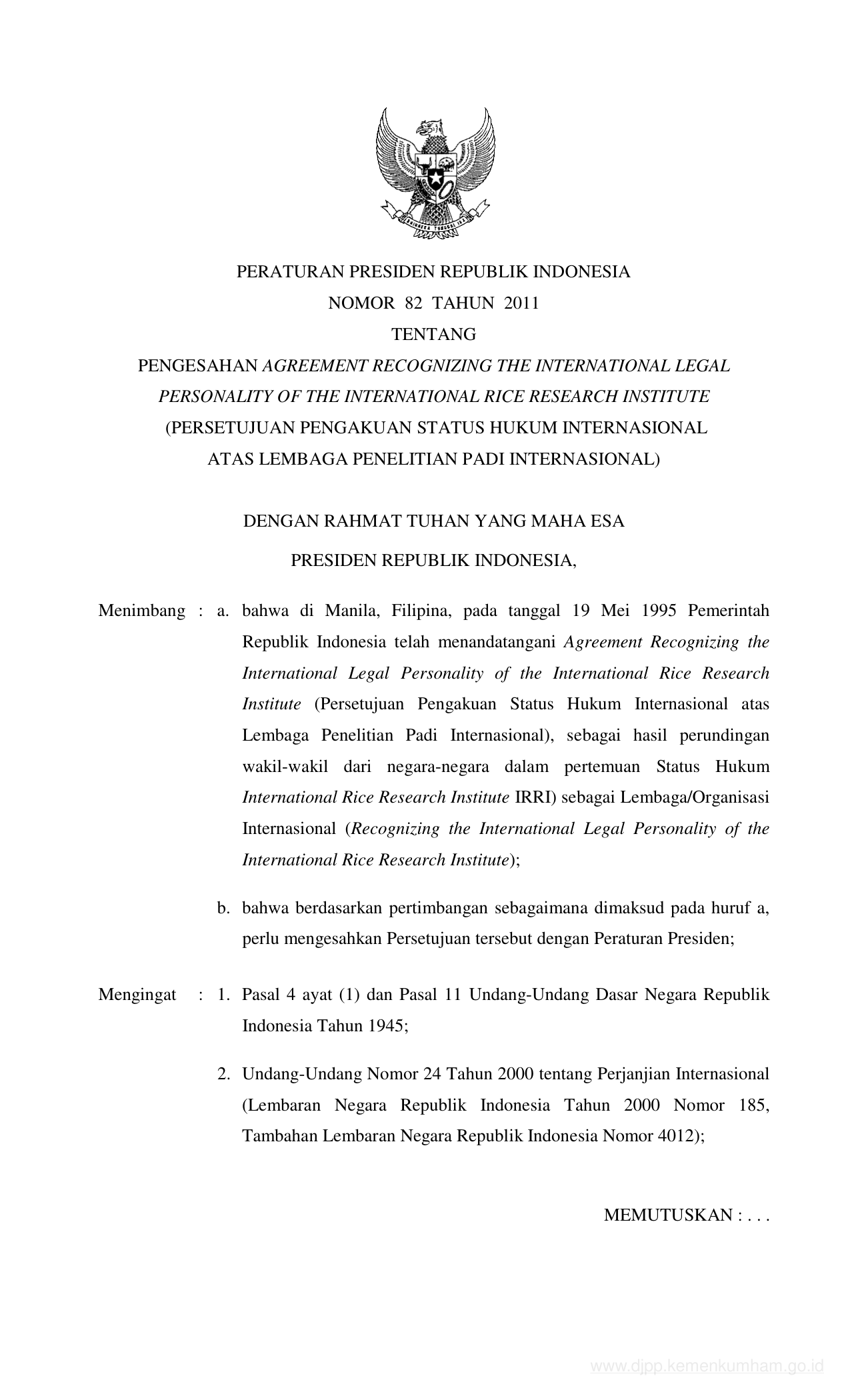 PERPRES Nomor 82 Tahun 2011 | Peraturan Presiden Nomor 82 Tahun 2011 tentang PENGESAHAN AGREEMENT RECOGNIZING THE INTERNATIONAL LEGAL PERSONALITY OF THE INTERNATIONAL RICE RESEARCH INSTITUTE (PERSETUJUAN PENGAKUAN STATUS HUKUM INTERNASIONAL ATAS LEMBAGA PENELITIAN PADI INTERNASIONAL)