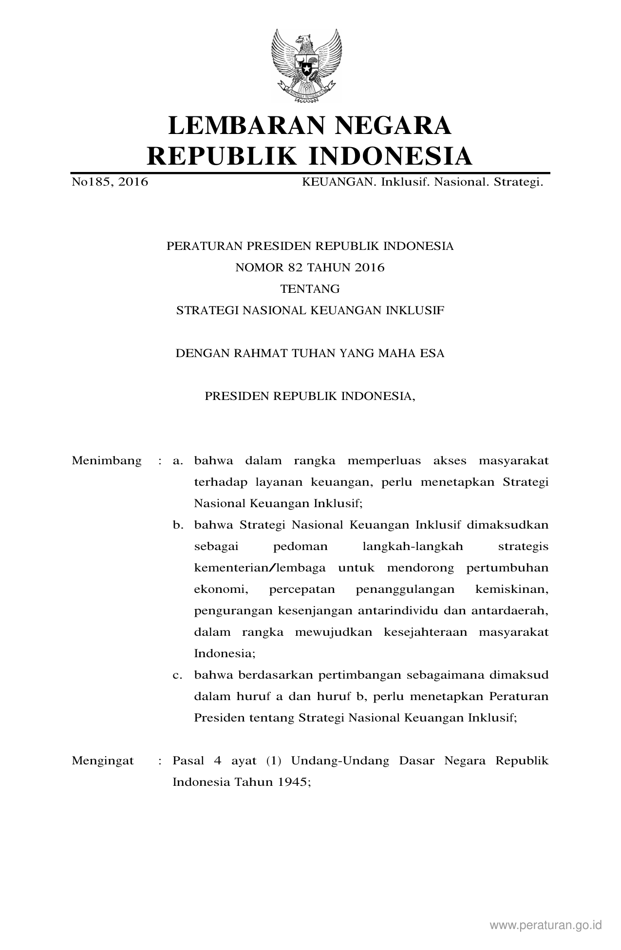 PERPRES Nomor 82 Tahun 2016 | Peraturan Presiden Nomor 82 Tahun 2016 tentang STRATEGI NASIONAL KEUANGAN INKLUSIF