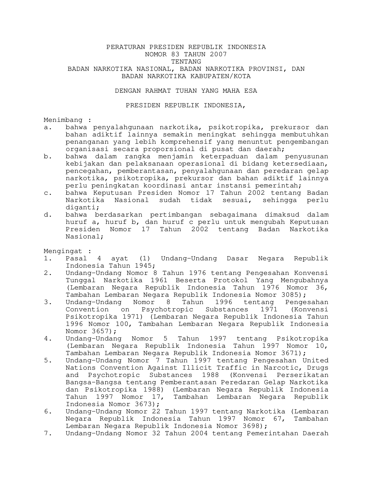 PERPRES Nomor 83 Tahun 2007 | Peraturan Presiden Nomor 83 Tahun 2007 tentang BADAN NARKOTIKA NASIONAL, BADAN NARKOTIKA PROVINSI, DAN BADAN NARKOTIKA KABUPATEN/KOTA