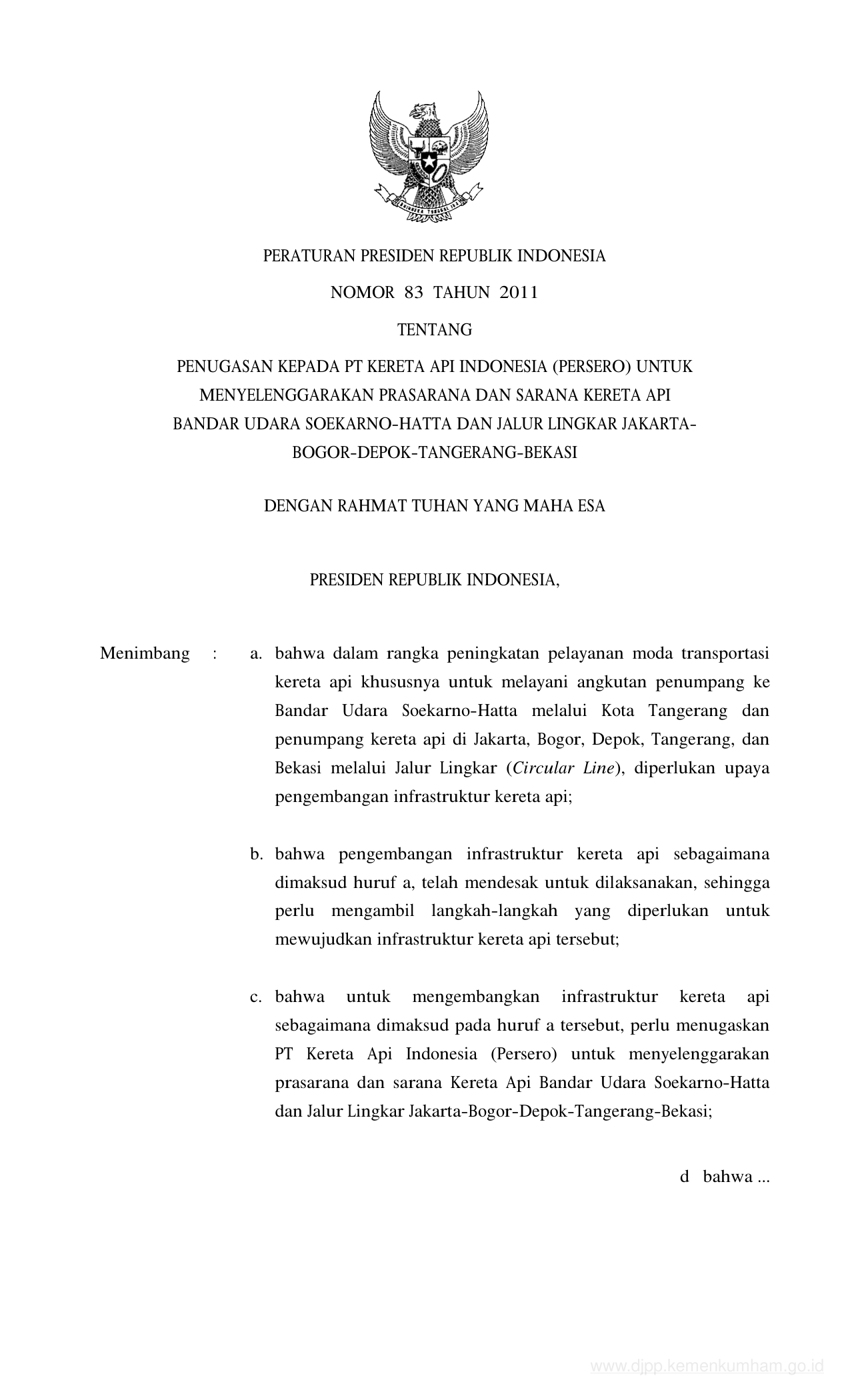 PERPRES Nomor 83 Tahun 2011 | Peraturan Presiden Nomor 83 Tahun 2011 tentang PENUGASAN KEPADA PT KERETA API INDONESIA (PERSERO) UNTUK MENYELENGGARAKAN PRASARANA DAN SARANA KERETA API BANDAR UDARA SOEKARNO-HATTA DAN JALUR LINGKAR JAKARTA-BOGOR-DEPOK-TANGERANG-BEKASI