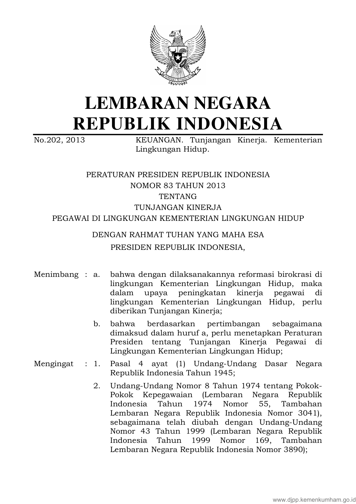 PERPRES Nomor 83 Tahun 2013 | Peraturan Presiden Nomor 83 Tahun 2013 tentang TUNJANGAN KINERJA PEGAWAI DI LINGKUNGAN KEMENTERIAN LINGKUNGAN HIDUP