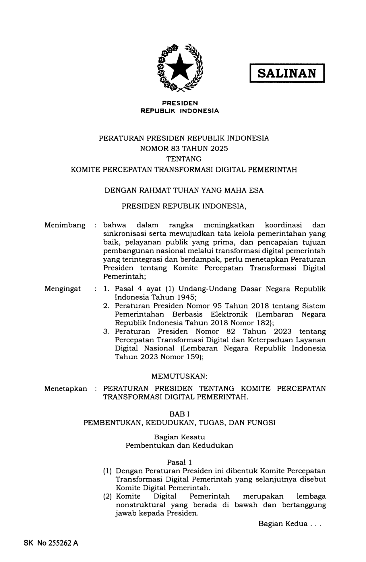 PERPRES Nomor 83 Tahun 2025 | Peraturan Presiden Nomor 83 Tahun 2025 tentang KOMITE PERCEPATAN TRANSFORMASI DIGITAL PEMERINTAH