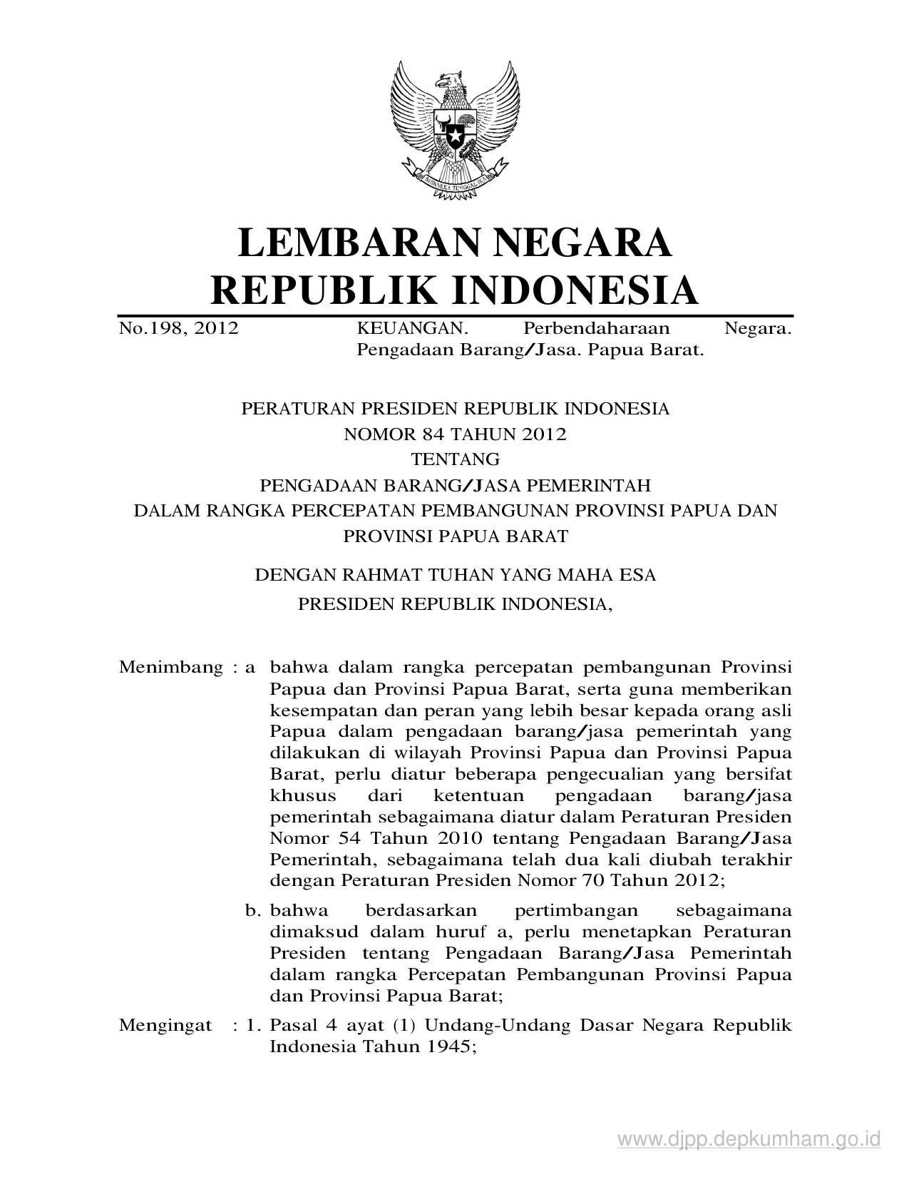 PERPRES Nomor 84 Tahun 2012 | Peraturan Presiden Nomor 84 Tahun 2012 tentang PENGADAAN BARANG/JASA PEMERINTAH DALAM RANGKA PERCEPATAN PEMBANGUNAN PROVINSI PAPUA DAN PROVINSI PAPUA BARAT