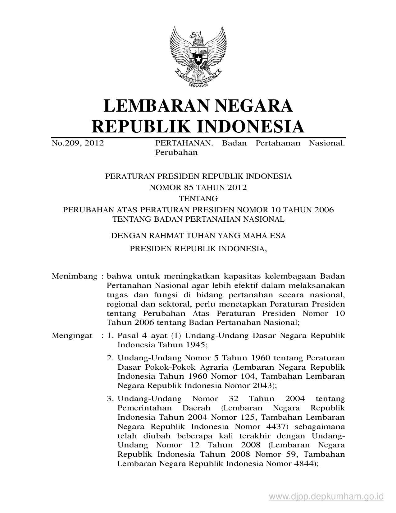 PERPRES Nomor 85 Tahun 2012 | Peraturan Presiden Nomor 85 Tahun 2012 tentang PERUBAHAN ATAS PERATURAN PRESIDEN NOMOR 10 TAHUN 2006 TENTANG BADAN PERTANAHAN NASIONAL