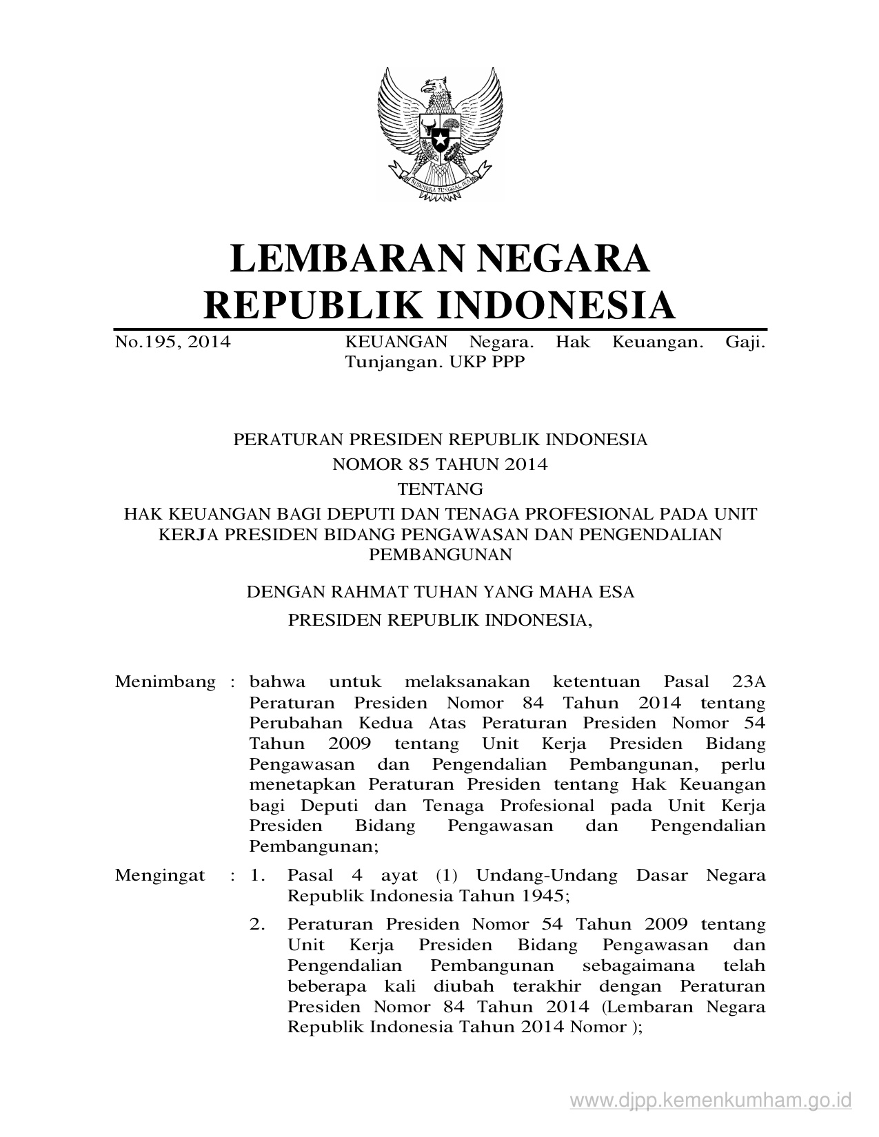 PERPRES Nomor 85 Tahun 2014 | Peraturan Presiden Nomor 85 Tahun 2014 tentang HAK KEUANGAN BAGI DEPUTI DAN TENAGA PROFESIONAL PADA UNIT KERJA PRESIDEN BIDANG PENGAWASAN DAN PENGENDALIAN PEMBANGUNAN