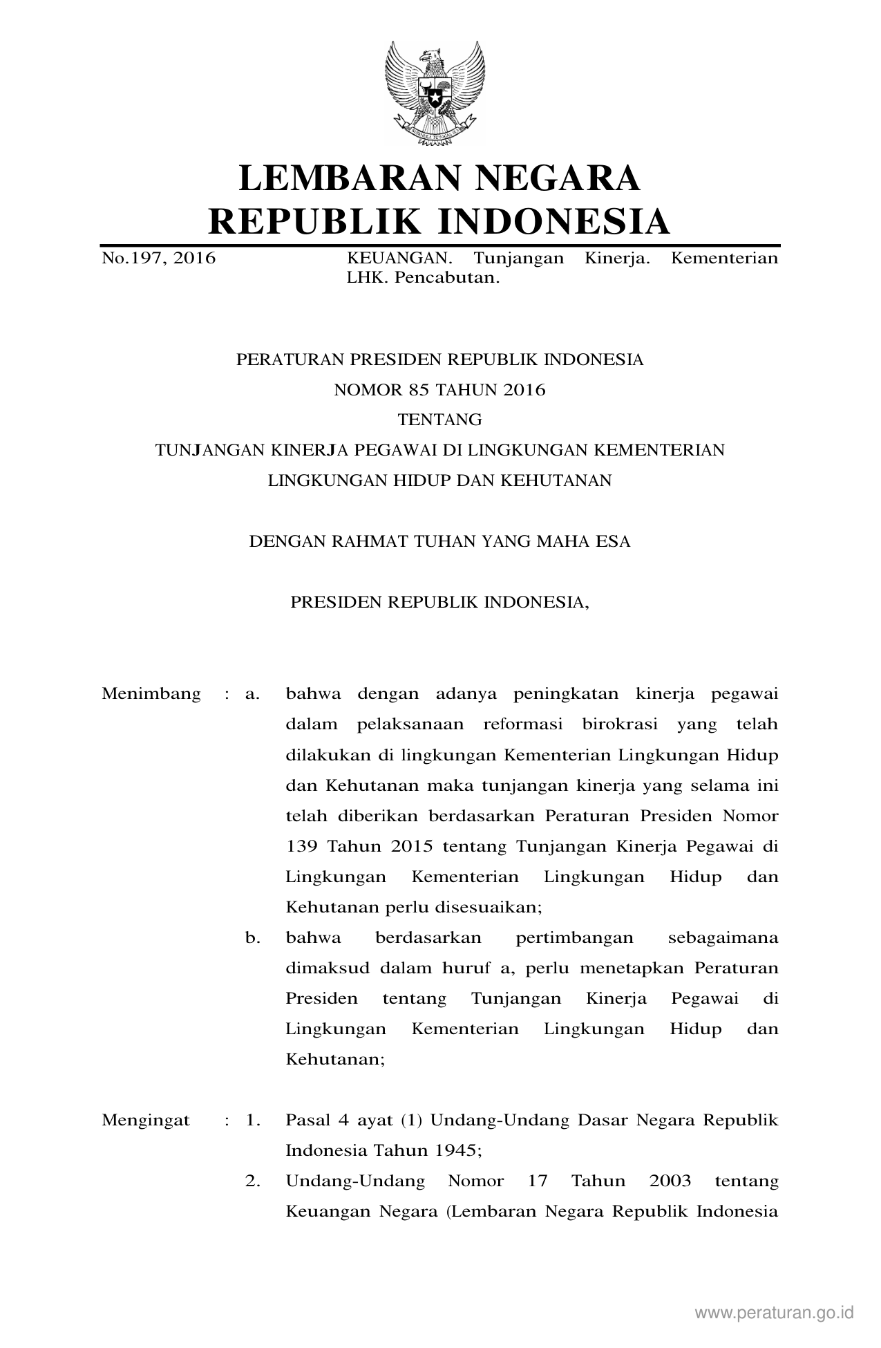 PERPRES Nomor 85 Tahun 2016 | Peraturan Presiden Nomor 85 Tahun 2016 tentang TUNJANGAN KINERJA PEGAWAI DI LINGKUNGAN KEMENTERIAN LINGKUNGAN HIDUP DAN KEHUTANAN