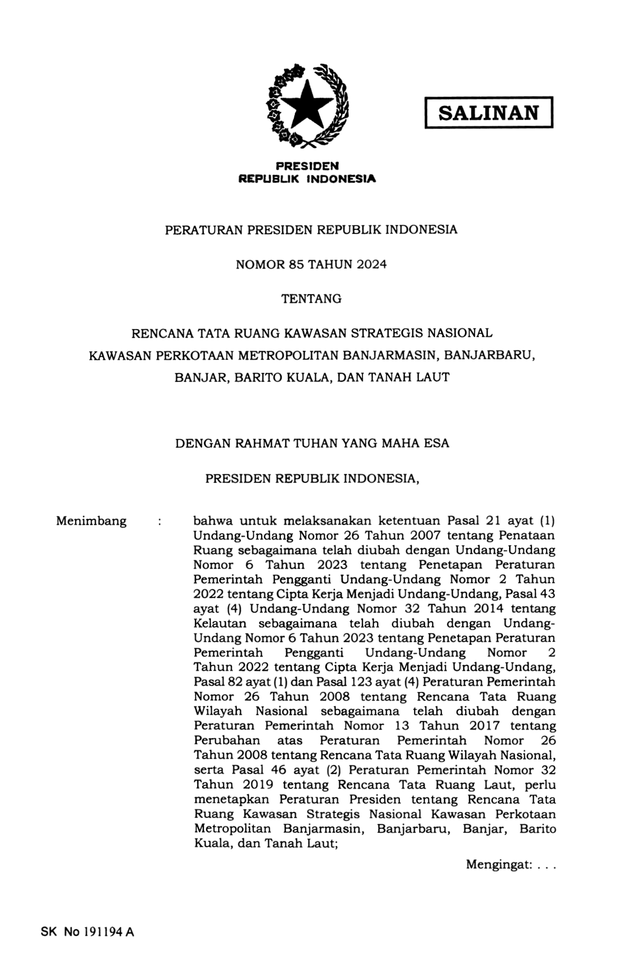 PERPRES Nomor 85 Tahun 2024 | Peraturan Presiden Nomor 85 Tahun 2024 tentang RENCANA TATA RUANG KAWASAN STRATEGIS NASIONAL KAWASAN PERKOTAAN METROPOLITAN BANJARMASIN, BANJARBARU, BANJAR, BARITO KUALA, DAN TANAH LAUT