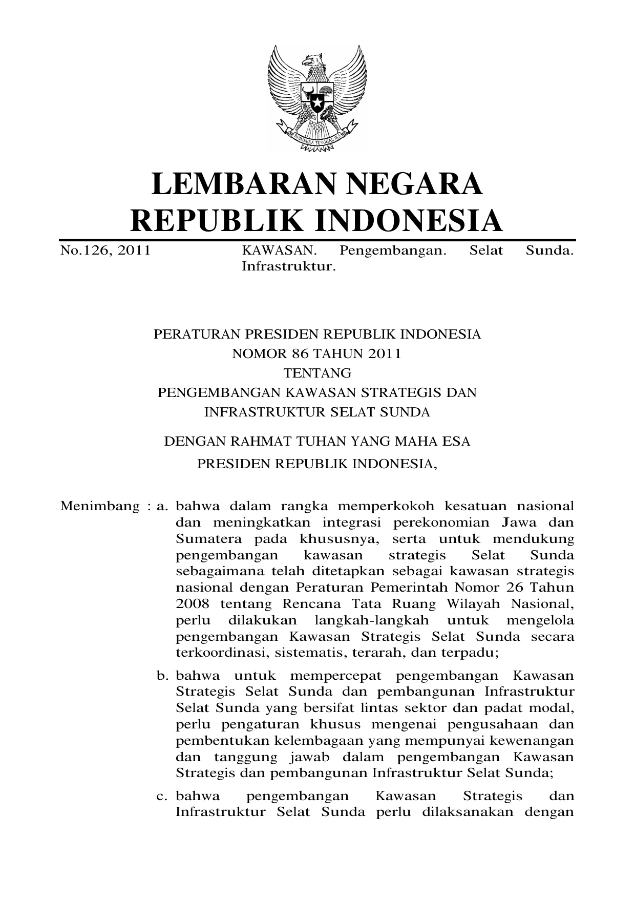 PERPRES Nomor 86 Tahun 2011 | Peraturan Presiden Nomor 86 Tahun 2011 tentang PENGEMBANGAN KAWASAN STRATEGIS DAN INFRASTRUKTUR SELAT SUNDA
