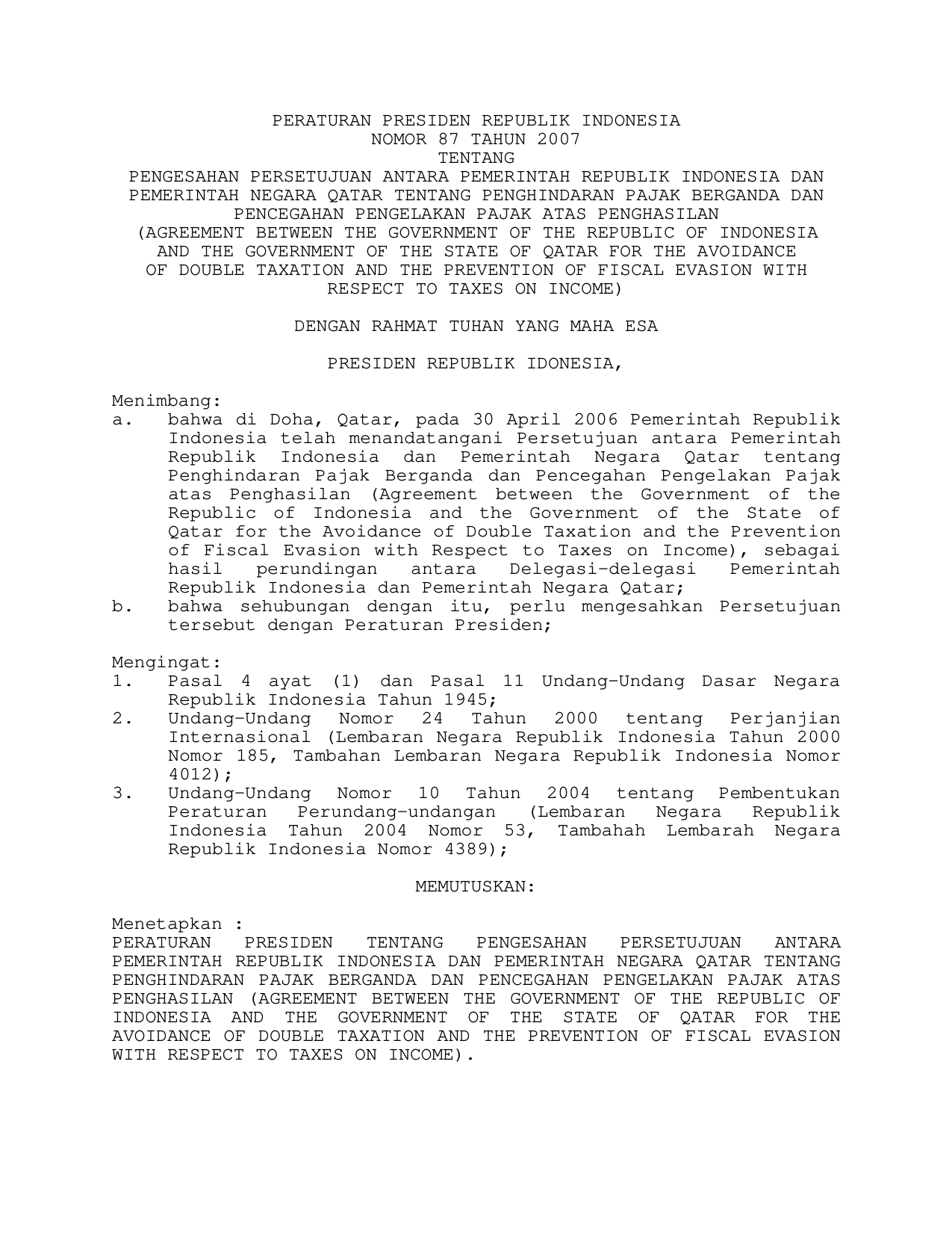 PERPRES Nomor 87 Tahun 2007 | Peraturan Presiden Nomor 87 Tahun 2007 tentang PENGESAHAN PERSETUJUAN ANTARA PEMERINTAH RI DAN PEMERINTAH NEGARA QATAR TENTANG PENGHINDARAN PAJAK BERGANDA DAN PENCEGAHAN PENGELAKAN PAJAK ATAS PENGHASILAN (AGREEMENT BETWEEN THE GOVERMENT OF THE REPUBLIK OF INDONESIA AND THE GOVERMENT OF THE STATE OF QATAR FOR THE AVOIDANCE OF DOUBLE TAXATION AND THE PREVENTION OF FISCAL EVASION WITH RESPECT TO TAXES ON INCOME)