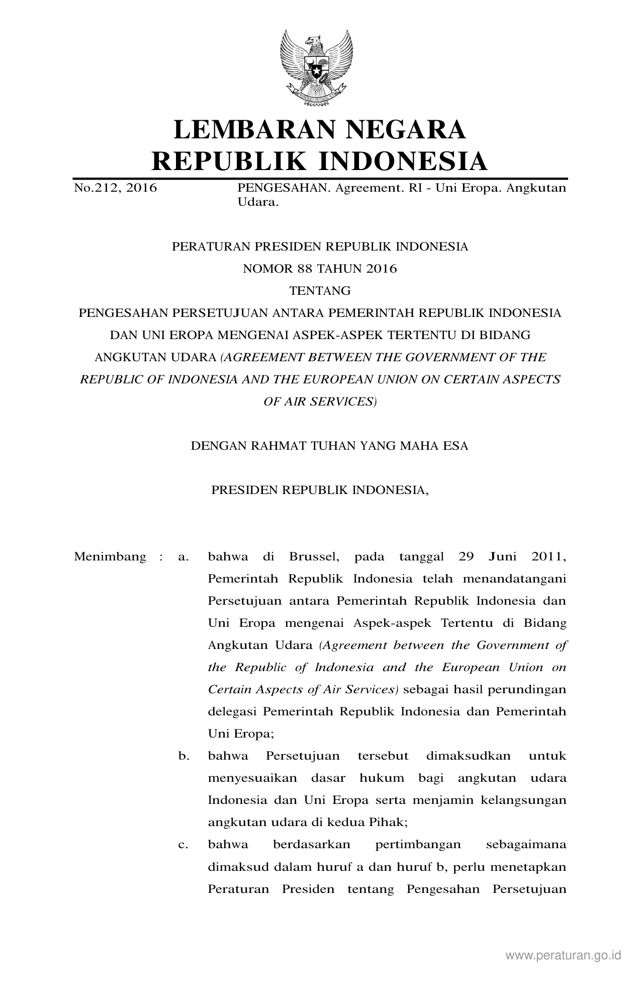 PERPRES Nomor 88 Tahun 2016 | Peraturan Presiden Nomor 88 Tahun 2016 tentang Pengesahan Persetujuan Antara Pemerintah Republik Indonesia dan Uni Eropa Mengenai Aspek-Aspek Tertentu di Bidang Angkutan Udara (Agreement Between The Government Of The Republic Of Indonesia And The European Union On Certain Aspects Of Air Services)