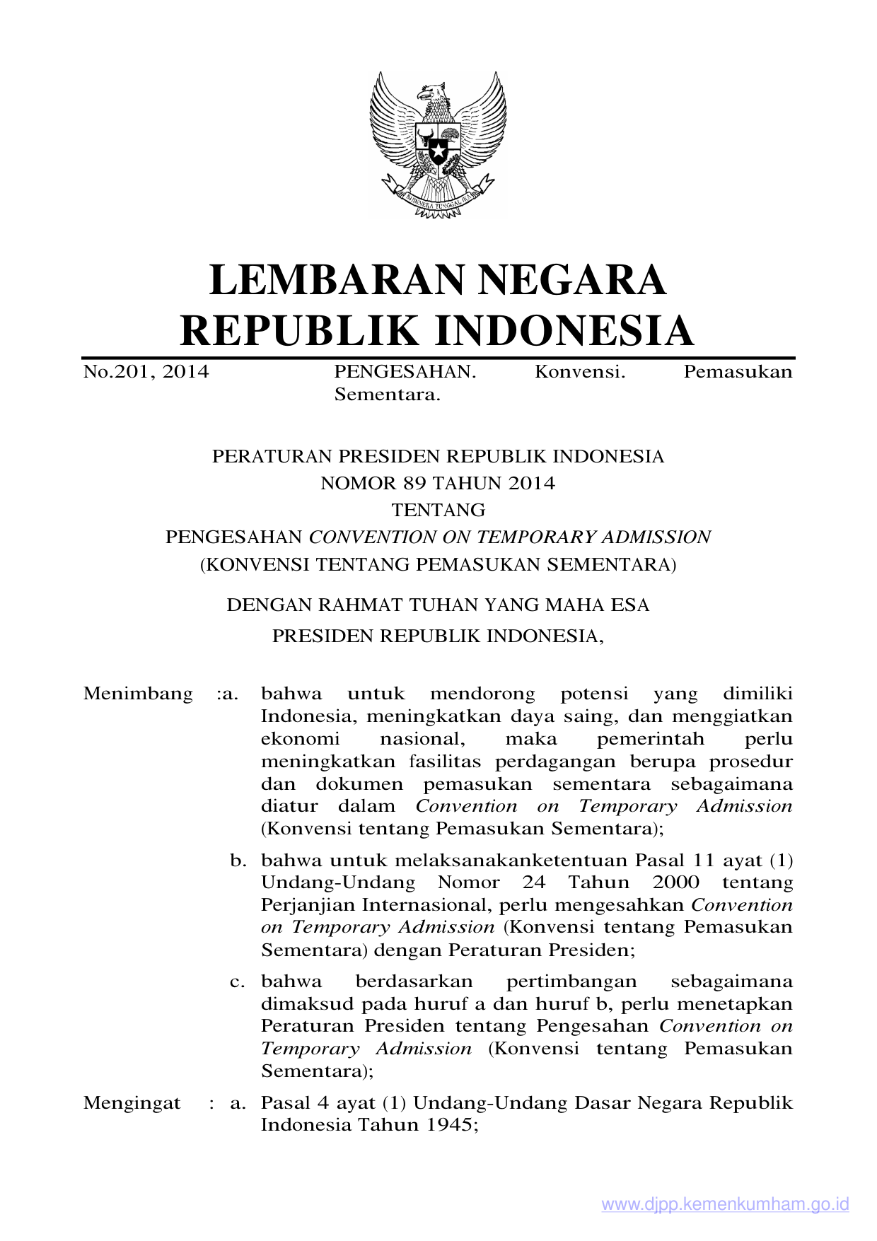 PERPRES Nomor 89 Tahun 2014 | Peraturan Presiden Nomor 89 Tahun 2014 tentang PENGESAHAN CONVENTION ON TEMPORARY ADMISSION(KONVENSI TENTANG PEMASUKAN SEMENTARA)
