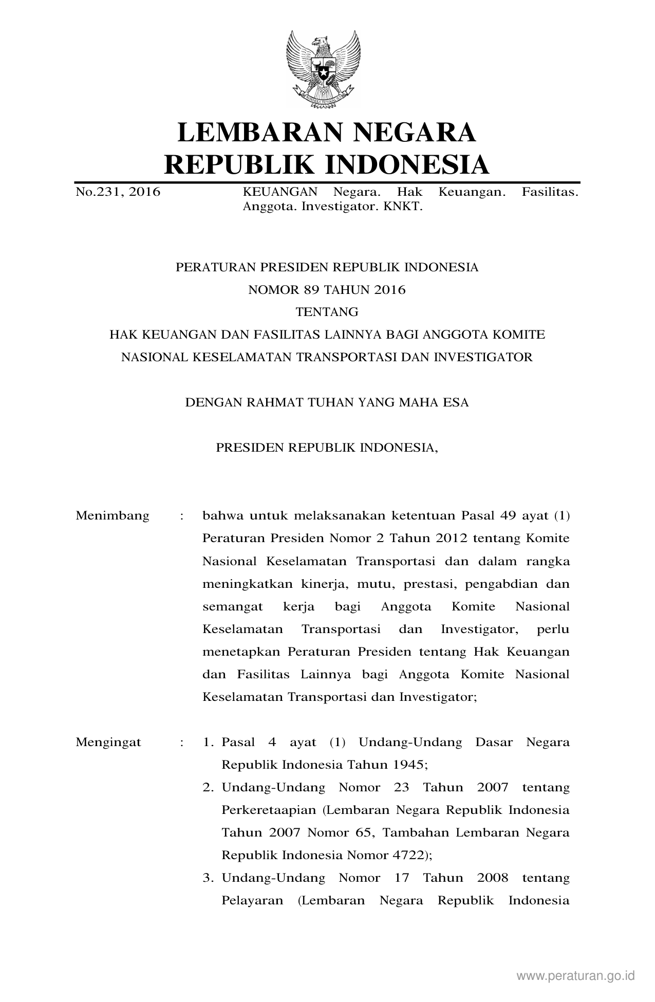 PERPRES Nomor 89 Tahun 2016 | Peraturan Presiden Nomor 89 Tahun 2016 tentang Hak Keuangan dan Fasilitas Lainnya Bagi Anggota Komite Nasional Keselamatan Transportasi dan Investigator