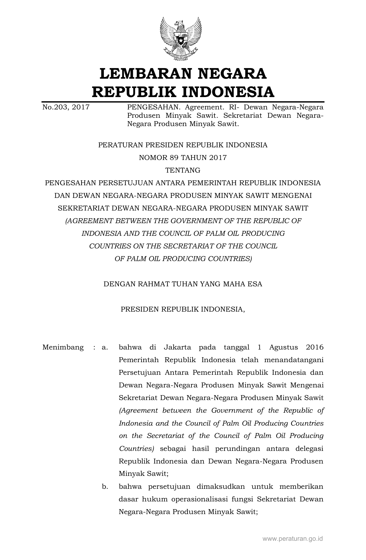 PERPRES Nomor 89 Tahun 2017 | Peraturan Presiden Nomor 89 Tahun 2017 tentang Pengesahan Persetujuan Antara Pemerintah Republik Indonesia dan Dewan Negara-Negara Produsen Minyak Sawit Mengenai Sekretariat Dewan Negara-Negara Produsen Minyak Sawit (Agreement Between The Government of the Republic of Indonesia and the Council of Palm Oil Producing Countries on the Secretariat of the Council of Palm Oil Producing Countries)