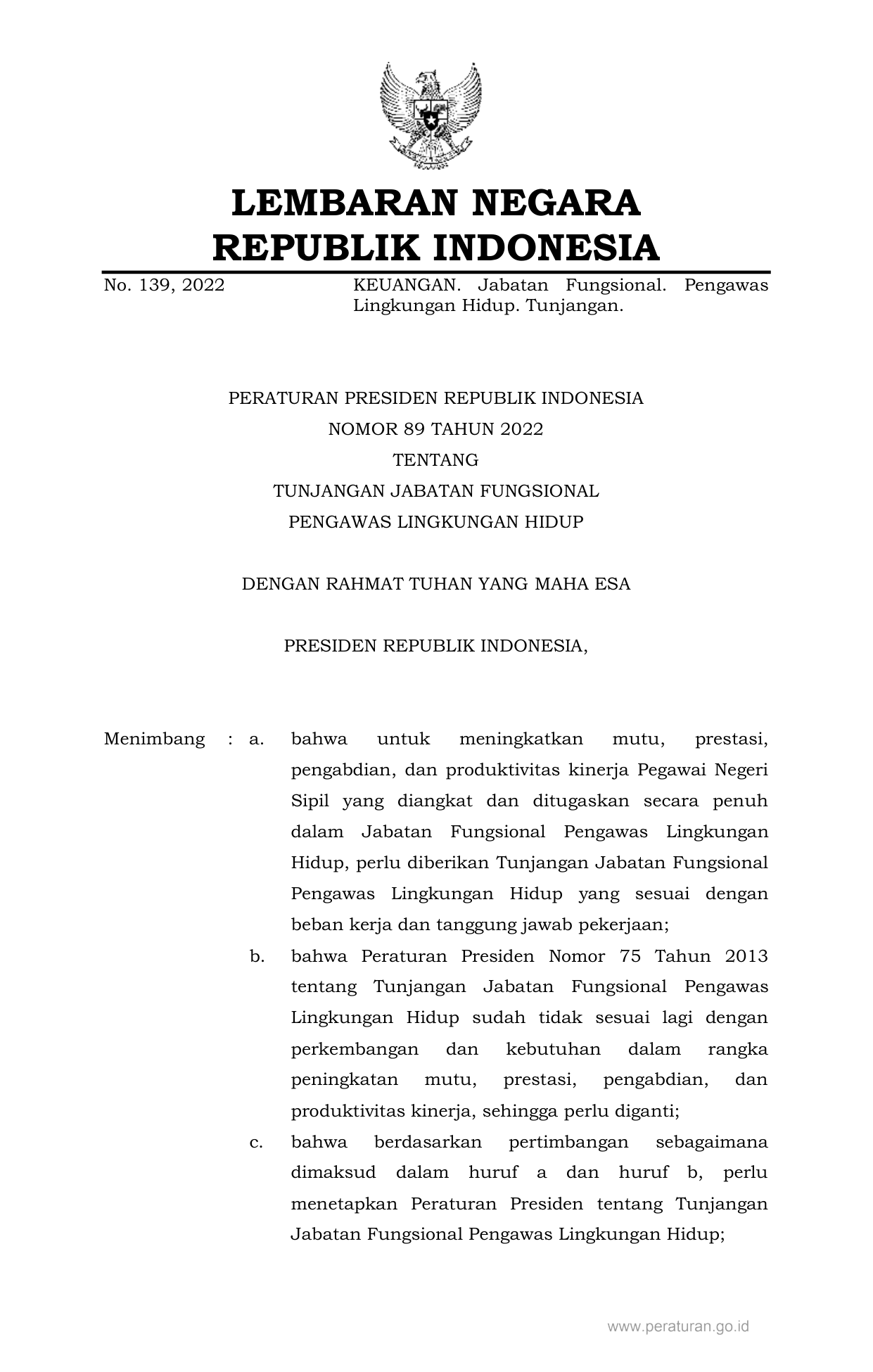 PERPRES Nomor 89 Tahun 2022 | Peraturan Presiden Nomor 89 Tahun 2022 tentang TUNJANGAN JABATAN FUNGSIONAL PENGAWAS LINGKUNGAN HIDUP