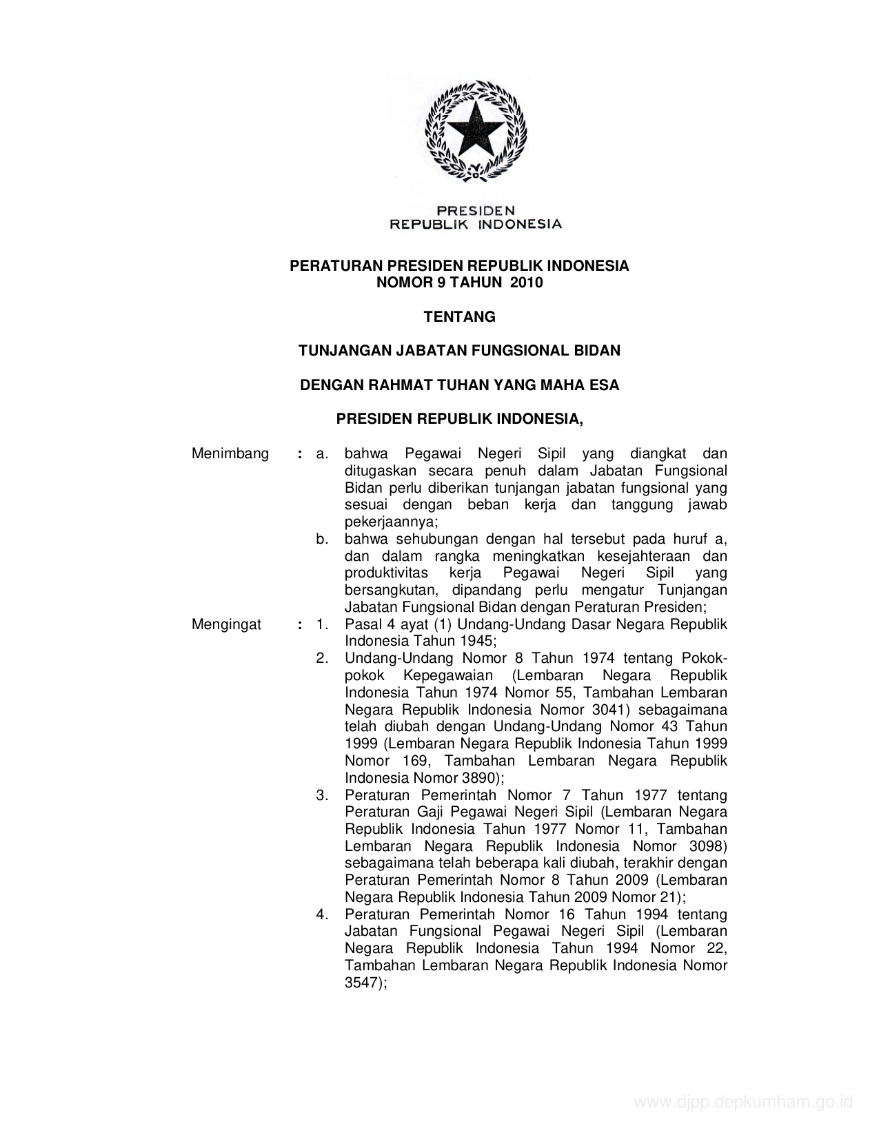 PERPRES Nomor 9 Tahun 2010 | Peraturan Presiden Nomor 9 Tahun 2010 tentang TUNJANGAN JABATAN FUNGSIONAL BIDAN