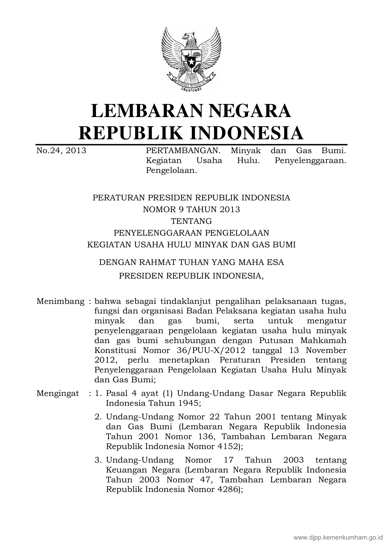 PERPRES Nomor 9 Tahun 2013 | Peraturan Presiden Nomor 9 Tahun 2013 tentang PENYELENGGARAAN PENGELOLAAN KEGIATAN USAHA HULU MINYAK DAN GAS BUMI