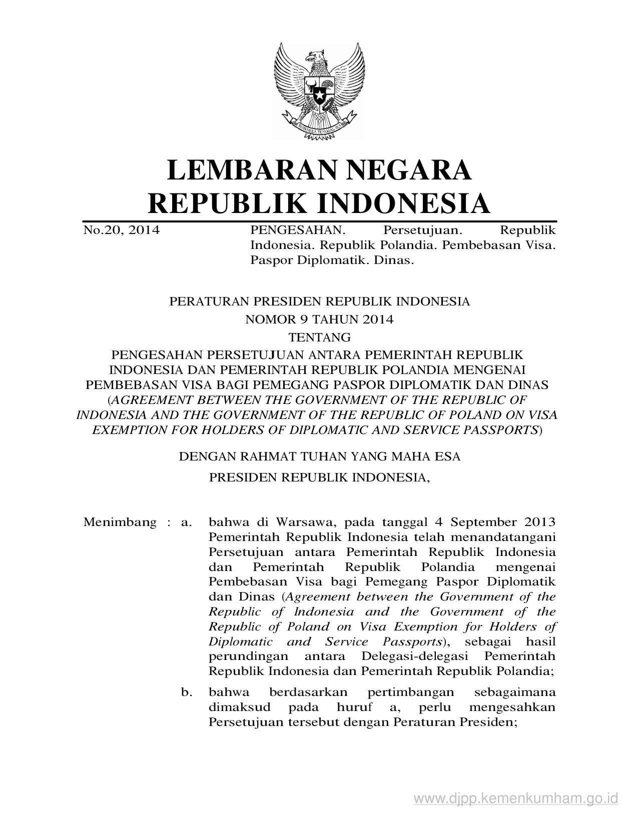PERPRES Nomor 9 Tahun 2014 | Peraturan Presiden Nomor 9 Tahun 2014 tentang PENGESAHAN PERSETUJUAN ANTARA PEMERINTAH REPUBLIK INDONESIA DAN PEMERINTAH REPUBLIK POLANDIA MENGENAI PEMBEBASAN VISA BAGI PEMEGANG PASPOR DIPLOMATIK DAN DINAS (AGREEMENT BETWEEN THE GOVERNMENT OF THE REPUBLIC OF INDONESIA AND THE GOVERNMENT OF THE REPUBLIC OF POLAND ON VISA EXEMPTION FOR HOLDERS OF DIPLOMATIC AND SERVICE PASSPORTS)