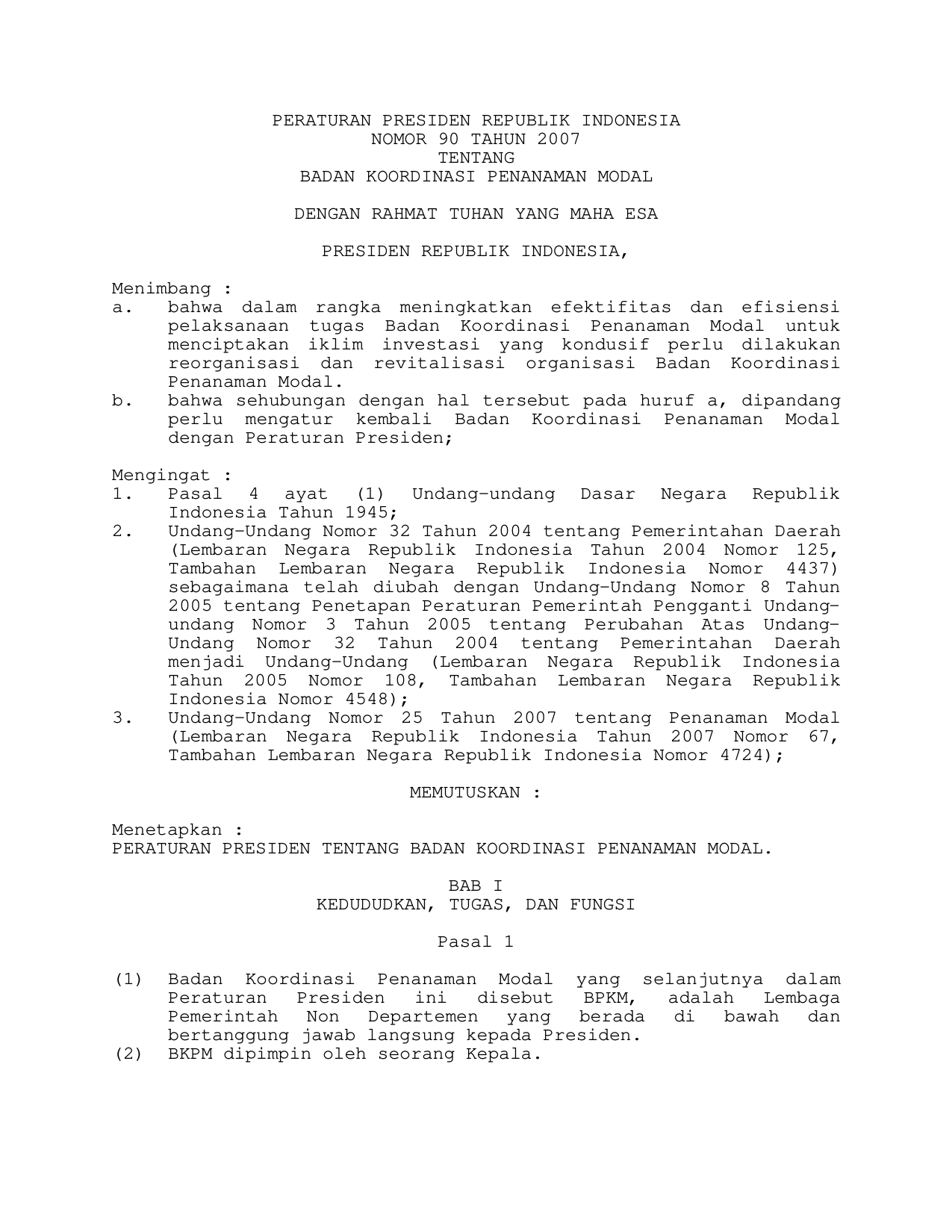 PERPRES Nomor 90 Tahun 2007 | Peraturan Presiden Nomor 90 Tahun 2007 tentang BADAN KOORDINASI PENANAMAN MODAL