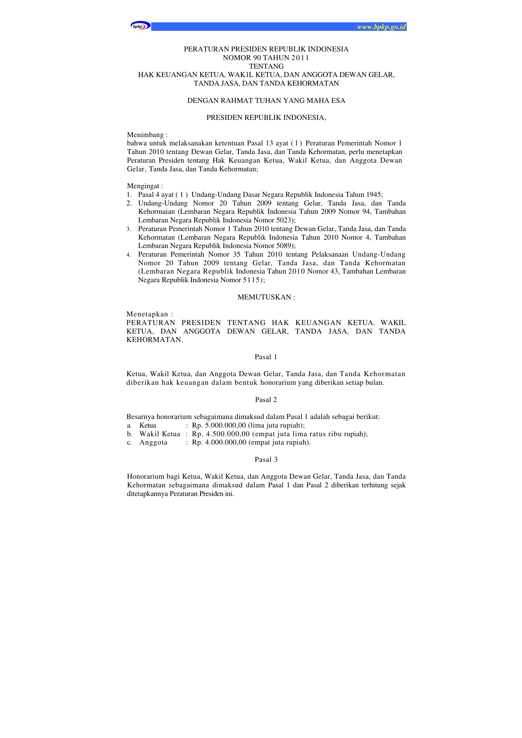 PERPRES Nomor 90 Tahun 2011 | Peraturan Presiden Nomor 90 Tahun 2011 tentang HAK KEUANGAN KETUA, WAKIL KETUA, DAN ANGGOTA DEWAN GELAR TANDA JASA, DAN TANDA KEHORMATAN