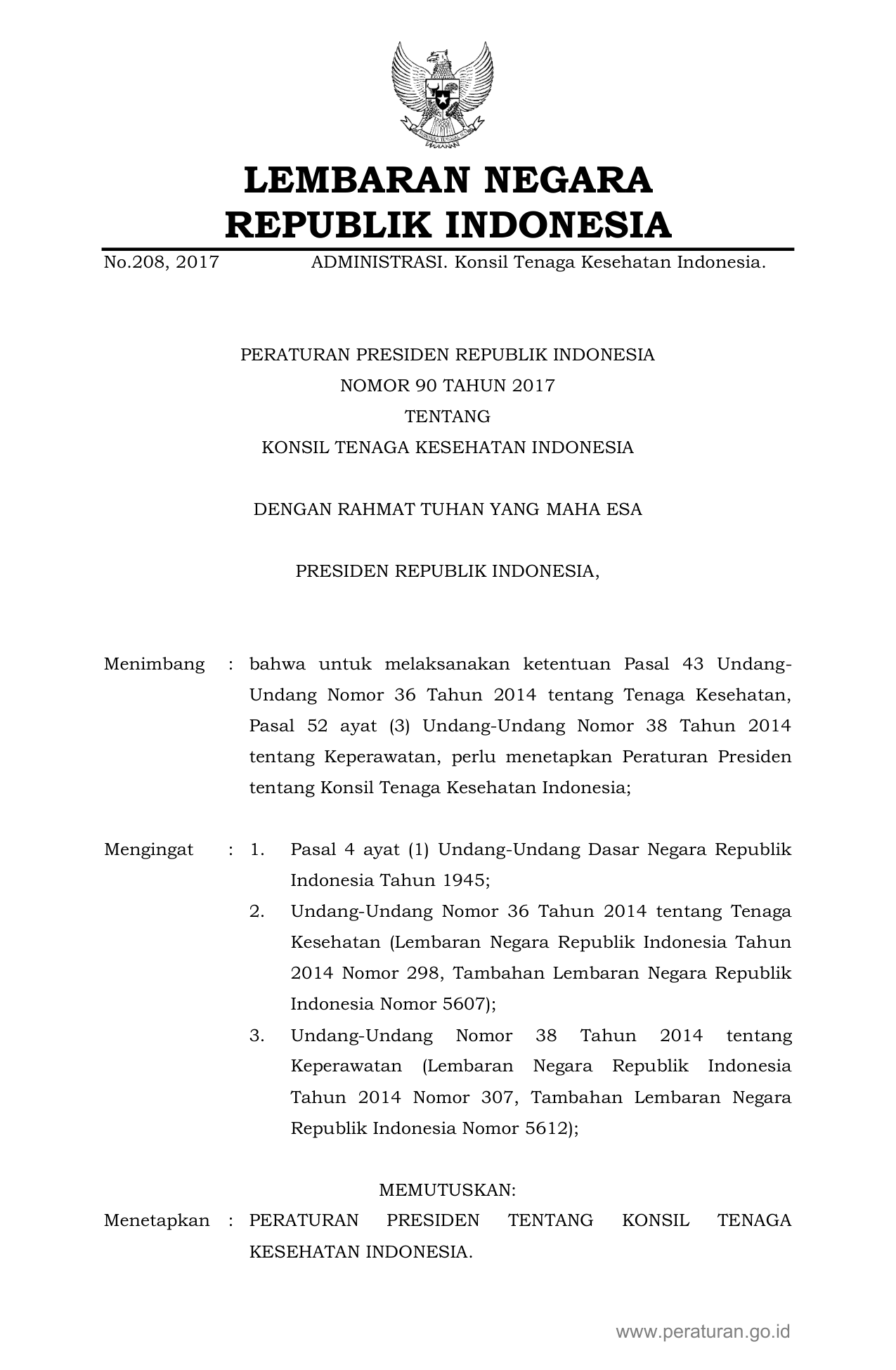 PERPRES Nomor 90 Tahun 2017 | Peraturan Presiden Nomor 90 Tahun 2017 tentang Konsil Tenaga Kesehatan Indonesia