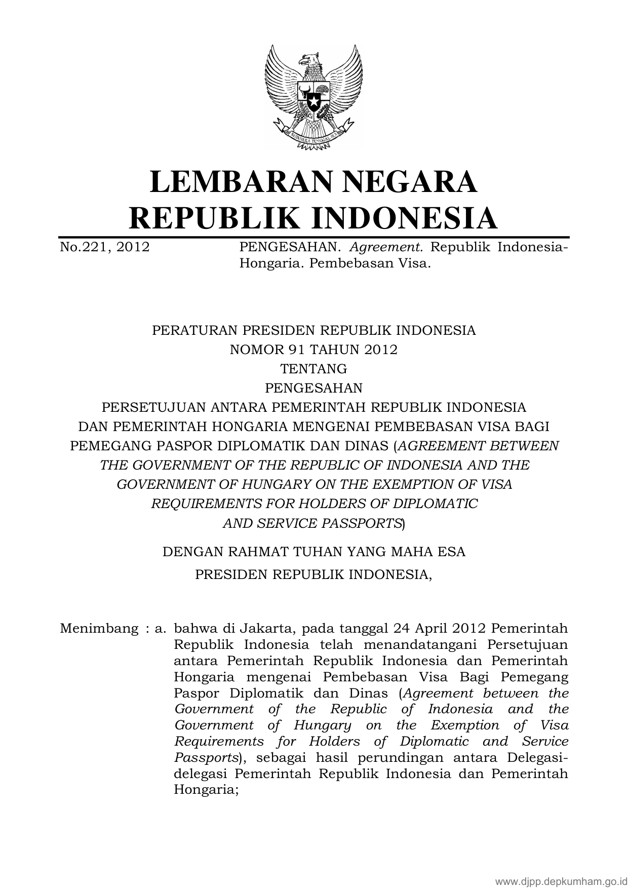 PERPRES Nomor 91 Tahun 2012 | Peraturan Presiden Nomor 91 Tahun 2012 tentang PENGESAHAN PERSETUJUAN ANTARA PEMERINTAH REPUBLIK INDONESIA DAN PEMERINTAH HONGARIA MENGENAI PEMBEBASAN VISA BAGI PEMEGANG PASPOR DIPLOMATIK DAN DINAS (AGREEMENT BETWEEN THE GOVERNMENT OF THE REPUBLIC OF INDONESIA AND THE GOVERNMENT OF HUNGARY ON THE EXEMPTION OF VISA REQUIREMENTS FOR HOLDERS OF DIPLOMATIC AND SERVICE PASSPORTS)