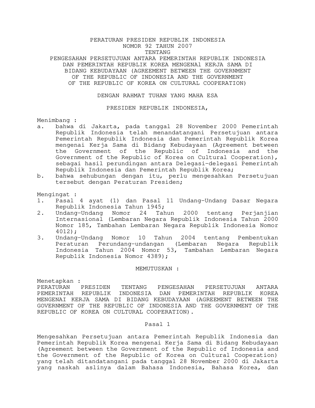 PERPRES Nomor 92 Tahun 2007 | Peraturan Presiden Nomor 92 Tahun 2007 tentang PENGESAHAN PERSETUJUAN ANTARA PEMERINTAH RI DAN PEMERINTAH REPUBLIK KOREA MENGENAI KERJASAMA DI BIDANG KEBUDAYAAN (AGREEMENT BETWEEN THE GOVERNMENT OF THE REPUBLIC OF INDONESIA AND THE REPUBLIC OF KOREA ON CULTURAL COOPERATION)
