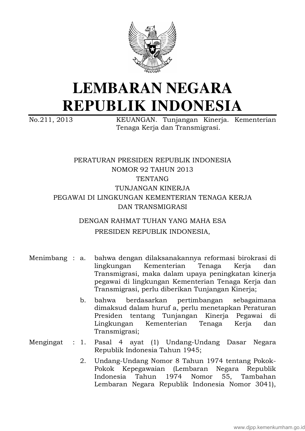 PERPRES Nomor 92 Tahun 2013 | Peraturan Presiden Nomor 92 Tahun 2013 tentang TUNJANGAN KINERJA PEGAWAI DI LINGKUNGAN KEMENTERIAN TENAGA KERJA DAN TRANSMIGRASI