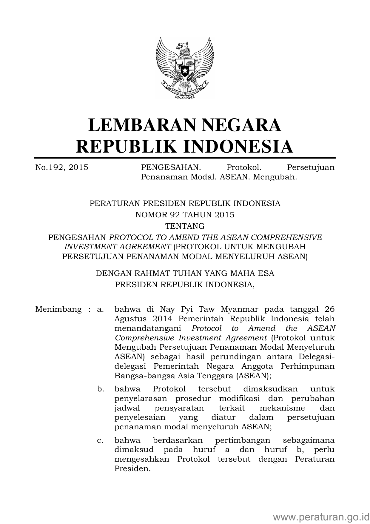 PERPRES Nomor 92 Tahun 2015 | Peraturan Presiden Nomor 92 Tahun 2015 tentang PENGESAHAN PROTOCOL TO AMEND THE ASEAN COMPREHENSIVE INVESMENT AGREEMENT PROTOKOL TO UNTUK MENGUBAH PERSETUJUAN PENANAMAN MODAL MENYELURUH ASEAN