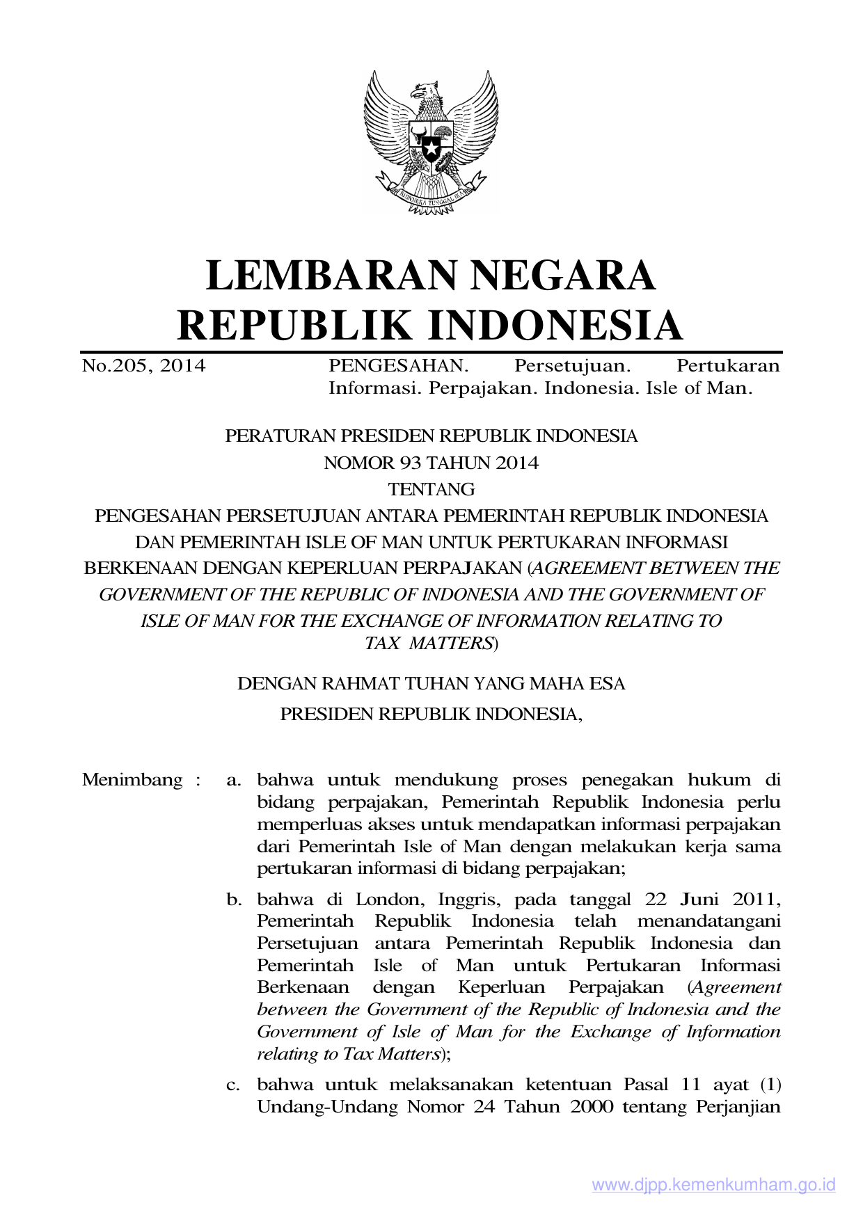 PERPRES Nomor 93 Tahun 2014 | Peraturan Presiden Nomor 93 Tahun 2014 tentang PENGESAHAN PERSETUJUAN ANTARA PEMERINTAH REPUBLIK INDONESIA DAN PEMERINTAH ISLE OF MAN UNTUK PERTUKARAN INFORMASI BERKENAAN DENGAN KEPERLUAN PERPAJAKAN (AGREEMENT BETWEEN THE GOVERNMENT OF THE REPUBLIC OF INDONESIA AND THE GOVERNMENT OF ISLE OF MAN FOR THE EXCHANGE OF INFORMATION RELATING TO TAX MATTERS)