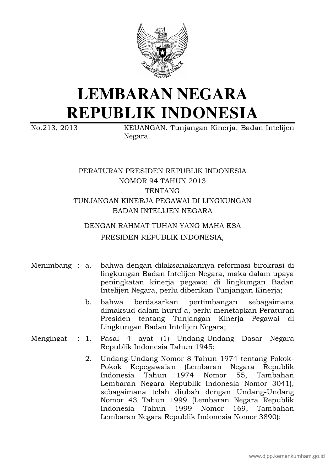 PERPRES Nomor 94 Tahun 2013 | Peraturan Presiden Nomor 94 Tahun 2013 tentang TUNJANGAN KINERJA PEGAWAI DI LINGKUNGAN BADAN INTELEJEN NEGARA