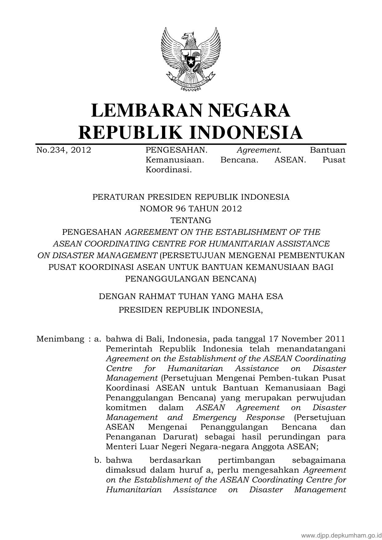 PERPRES Nomor 96 Tahun 2012 | Peraturan Presiden Nomor 96 Tahun 2012 tentang PENGESAHAN AGREEMENT ON THE ESTABLISHMENT OF THE ASEAN COORDINATING CENTRE FOR HUMANITARIAN ASSISTANCE ON DISASTER MANAGEMENT (PERSETUJUAN MENGENAI PEMBENTUKAN PUSAT KOORDINASI ASEAN UNTUK BANTUAN KEMANUSIAAN BAGI PENANGGULANGAN BENCANA)