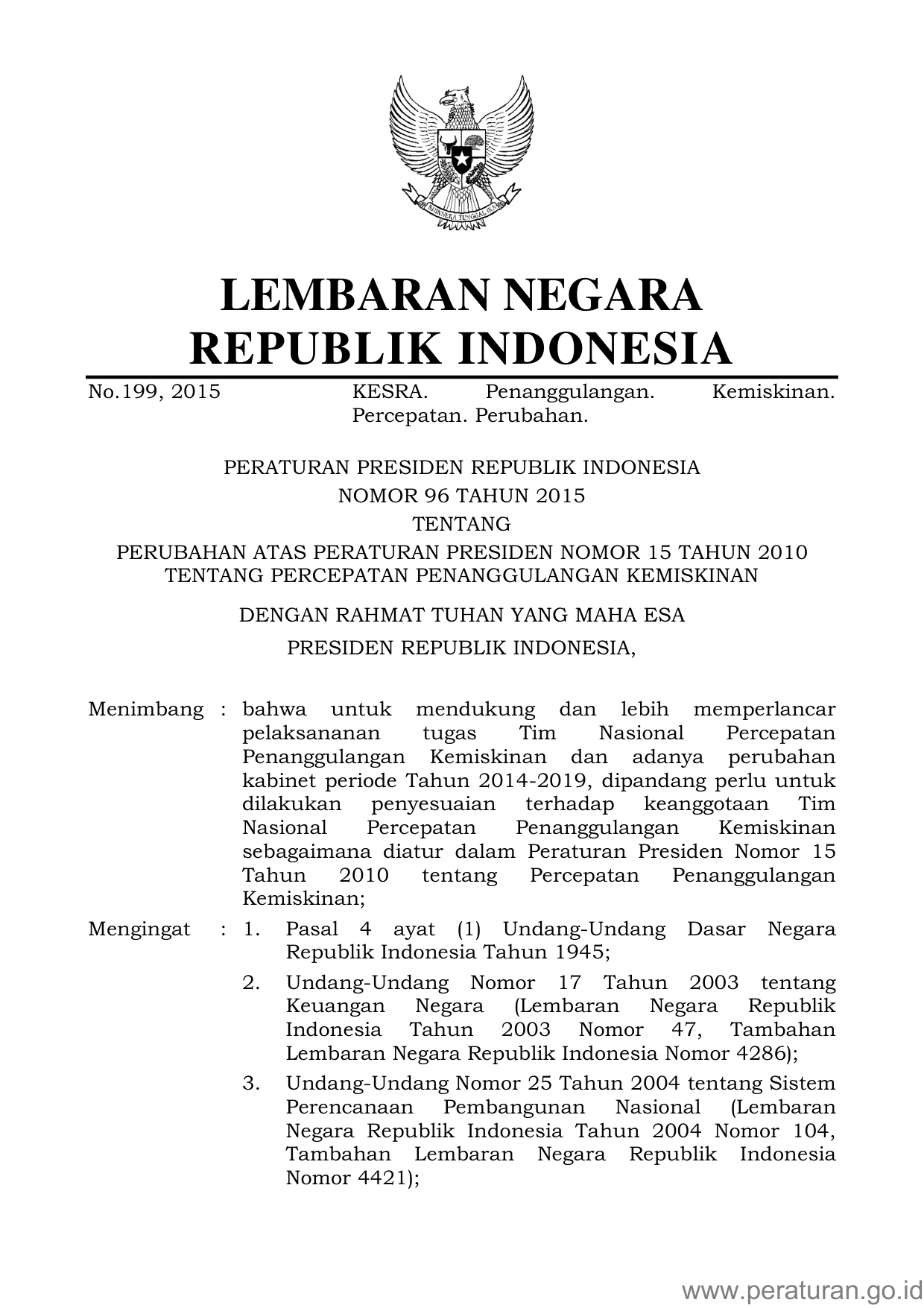 PERPRES Nomor 96 Tahun 2015 | Peraturan Presiden Nomor 96 Tahun 2015 tentang PERUBAHAN ATAS PERATURAN PRESIDEN NOMOR 15 TAHUN 2010 TENTANG PERCEPATAN PENANGGULANGAN KEMISKINAN