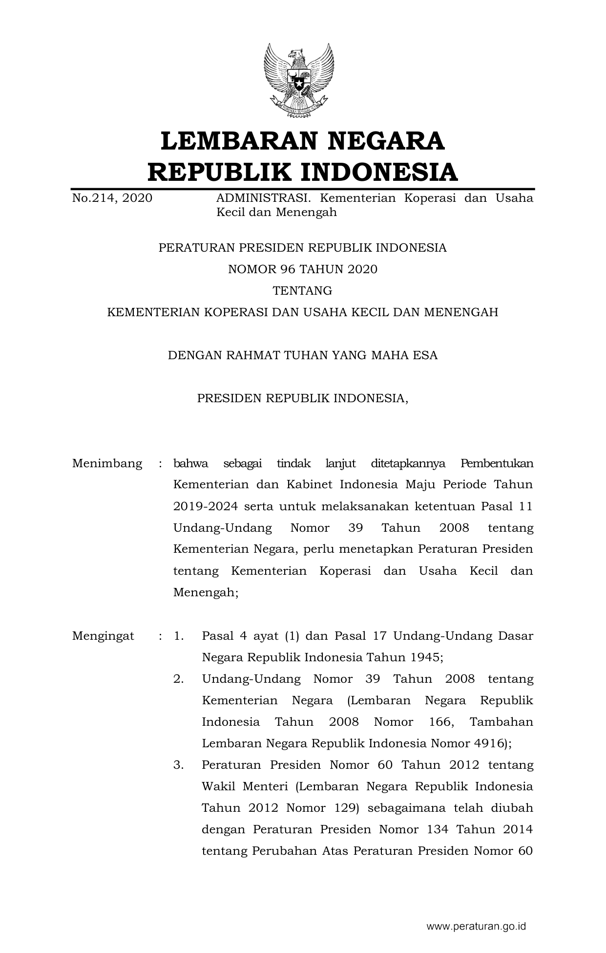 PERPRES Nomor 96 Tahun 2020 | Peraturan Presiden Nomor 96 Tahun 2020 tentang KEMENTERIAN KOPERASI DAN USAHA KECIL DAN MENENGAH
