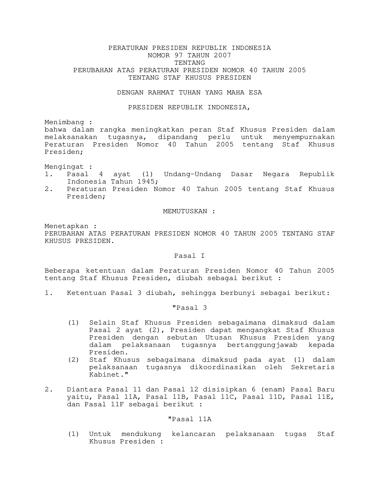 PERPRES Nomor 97 Tahun 2007 | Peraturan Presiden Nomor 97 Tahun 2007 tentang PERUBAHAN PERPRES 40-2005 TENTANG STAF KHUSUS PRESIDEN