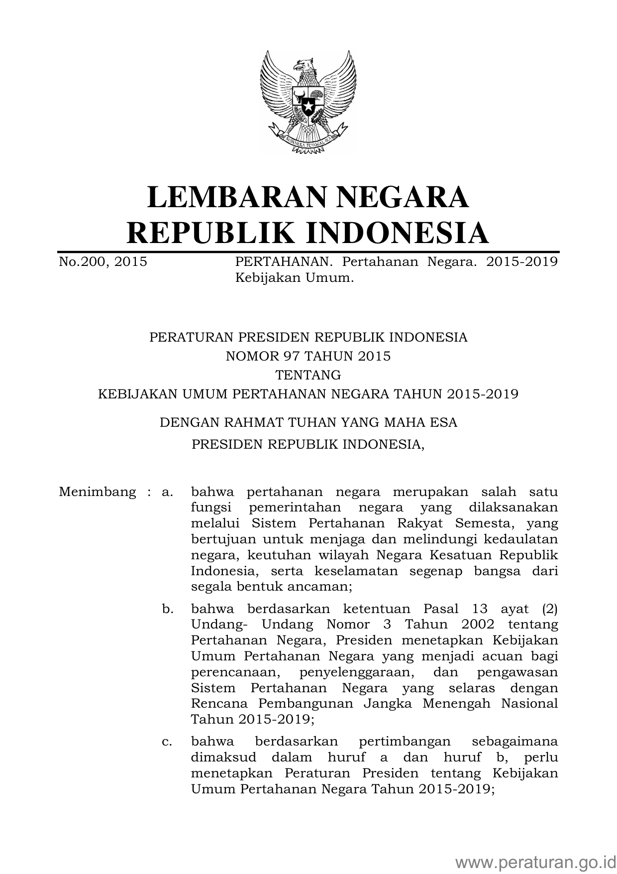 PERPRES Nomor 97 Tahun 2015 | Peraturan Presiden Nomor 97 Tahun 2015 tentang KEBIJAKAN UMUM PERTAHANAN NEGARA TAHUN 2015-2019