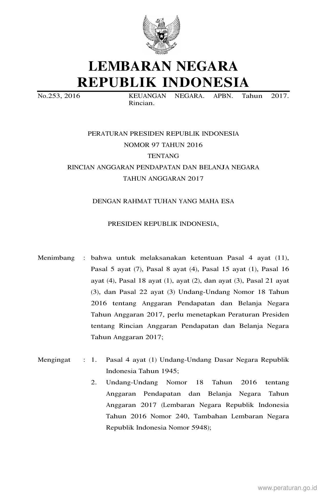 PERPRES Nomor 97 Tahun 2016 | Peraturan Presiden Nomor 97 Tahun 2016 tentang Rincian Anggaran Pendapatan Dan Belanja Negara Tahun Anggaran 2017