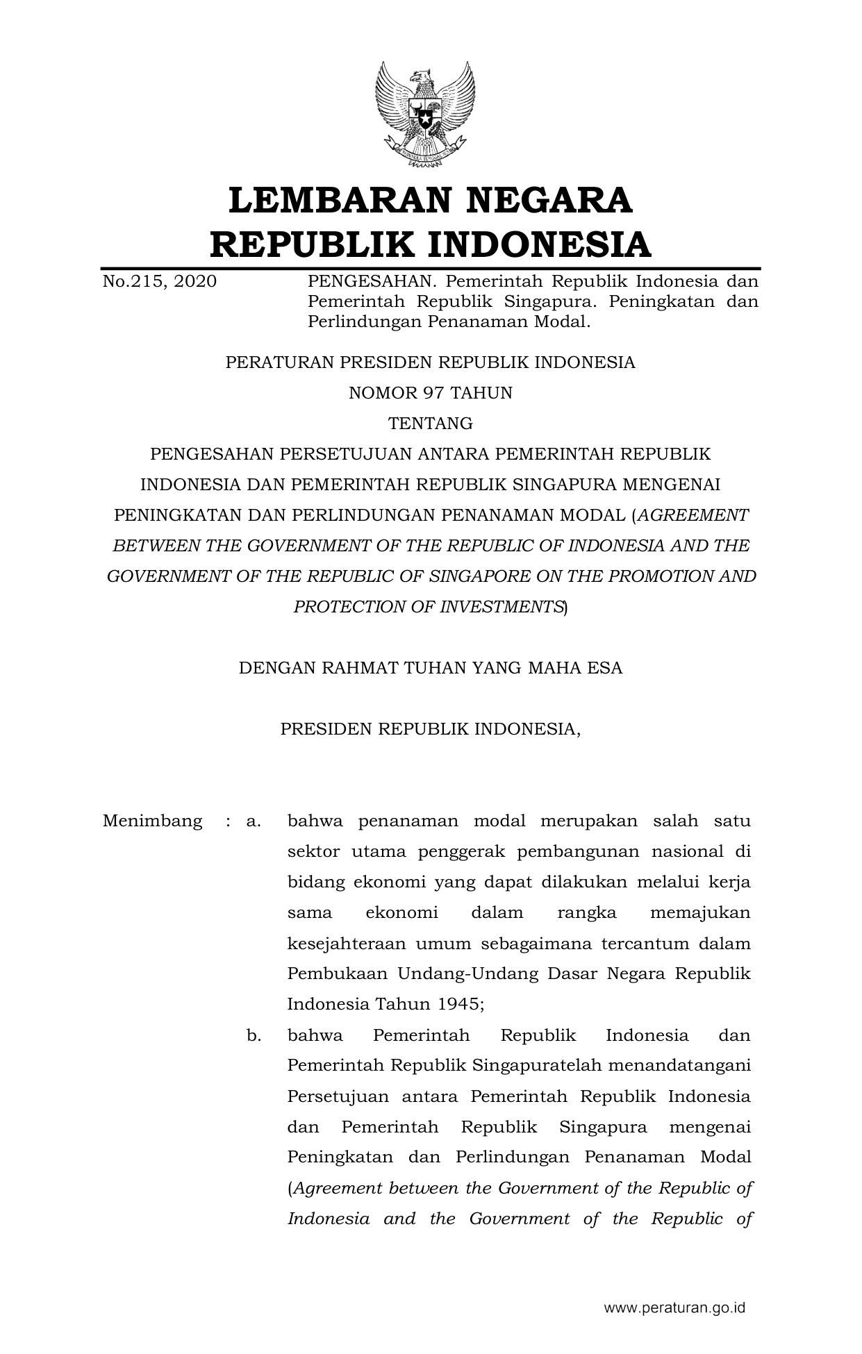 PERPRES Nomor 97 Tahun 2020 | Peraturan Presiden Nomor 97 Tahun 2020 tentang PENGESAHAN PERSETUJUAN ANTARA PEMERINTAH REPUBLIK INDONESIA DAN PEMERINTAH REPUBLIK SINGAPURA MENGENAI PENINGKATAN DAN PERLINDUNGAN PENANAMAN MODAL (AGREEMENT BETWEEN THE GOVERNMENT OF THE REPUBLIC OF INDONESIA AND THE GOVERNMENT OF THE REPUBLIC OF SINGAPORE ON THE PROMOTION AND PROTECTION OF INVESTMENTS)