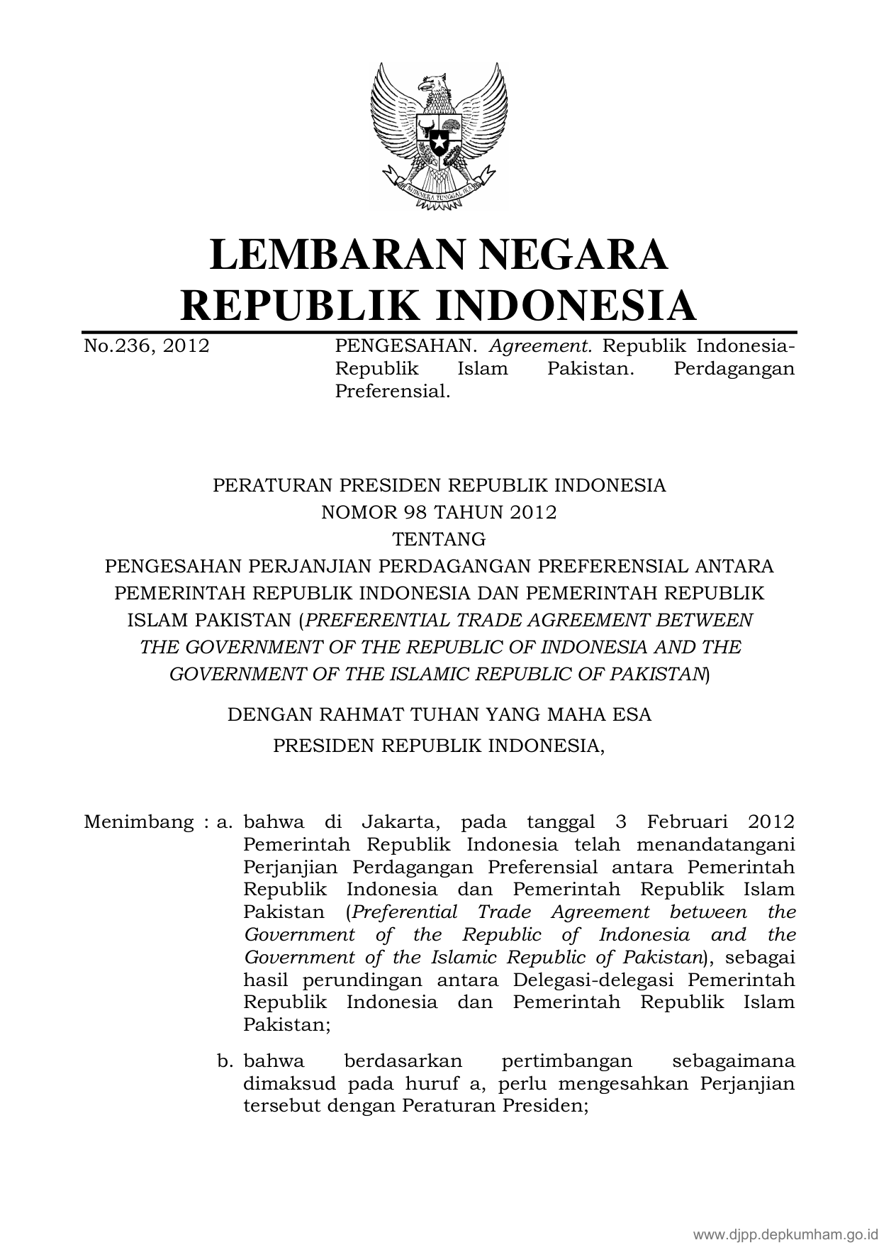 PERPRES Nomor 98 Tahun 2012 | Peraturan Presiden Nomor 98 Tahun 2012 tentang PENGESAHAN PERJANJIAN PERDAGANGAN PREFERENSIAL ANTARA PEMERINTAH REPUBLIK INDONESIA DAN PEMERINTAH REPUBLIK ISLAM PAKISTAN (PREFERENTIAL TRADE AGREEMENT BETWEEN THE GOVERNMENT OF THE REPUBLIC OF INDONESIA AND THE GOVERNMENT OF THE ISLAMIC REPUBLIC OF PAKISTAN)